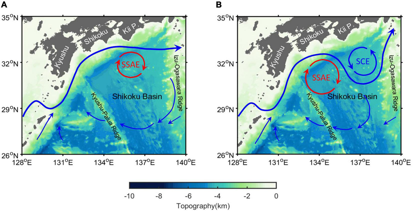 Schematic diagrams of the sea surface currents (blue curves) and topography (color) for the (A) NLM and (B) LM paths in the region off the southern coast of Japan. The subsurface anticyclonic eddy (SSAE) and enhanced surface (SCE) cyclonic eddy associated with the formation of the LM path are indicated by red and blue curves, respectively.