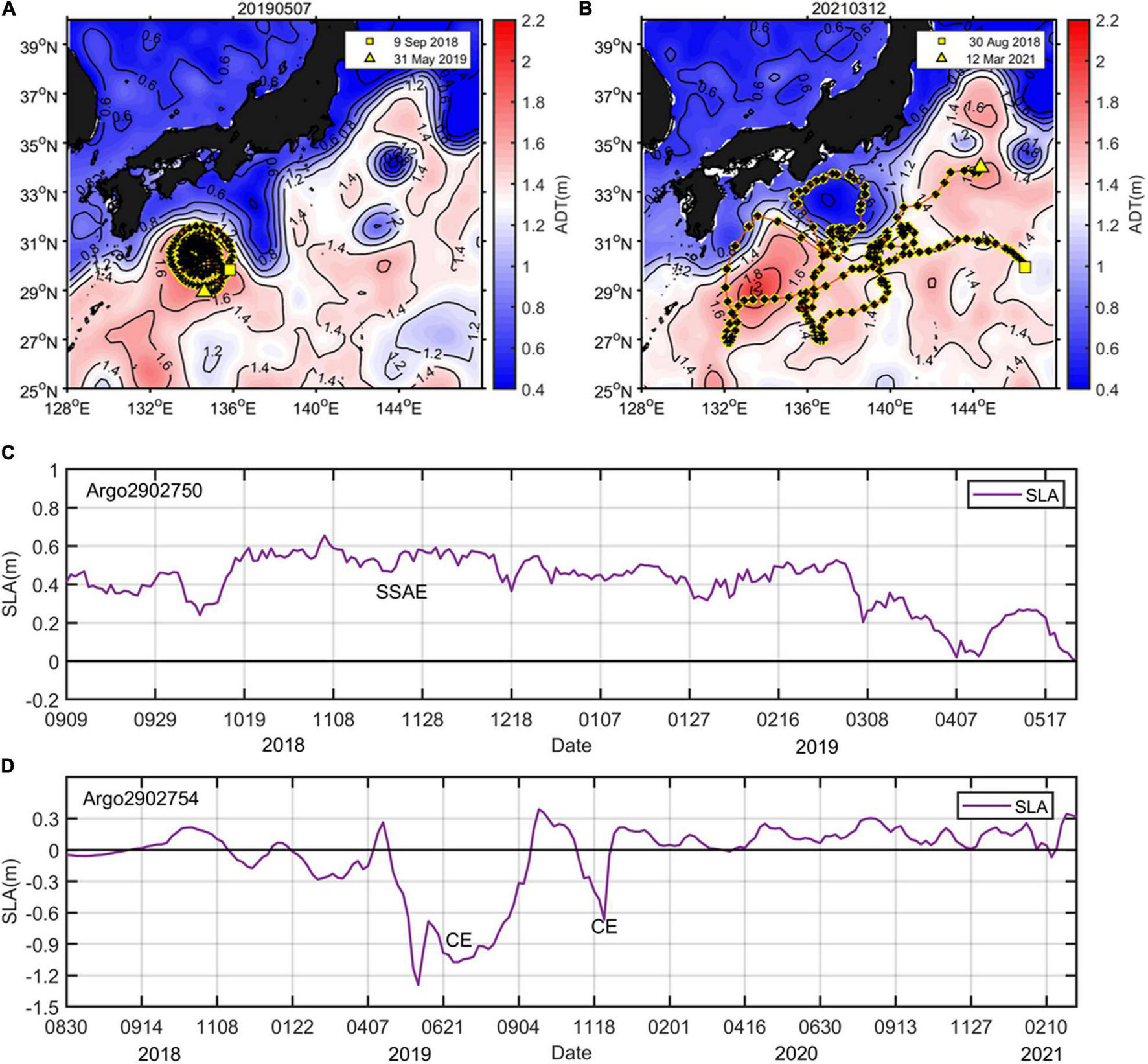 Tracks and the simultaneous time series of SLA of the BGC-Argo 2902750 (A,C) and BGC-Argo 2902754 (B,D) deployed in the Northwest Pacific. The background represents the absolute dynamic topography (ADT; contour and color, units: m) on the specific day of observation. The location of the first and last profiling of the floats is marked by squares and triangles, respectively.