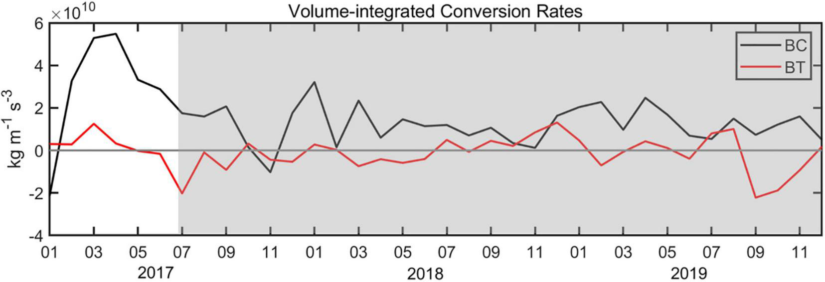 Time series of two conversion rates volume-integrated (upper 1,000 m) over the area (30°–35°N, 132°–140°E). LM path periods are shaded.