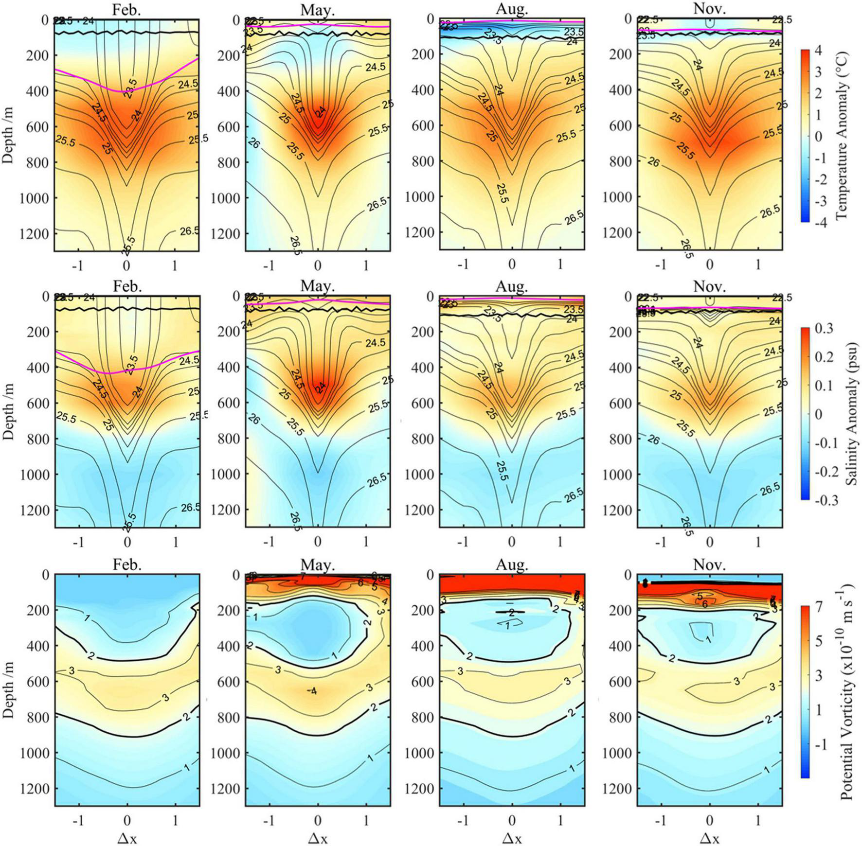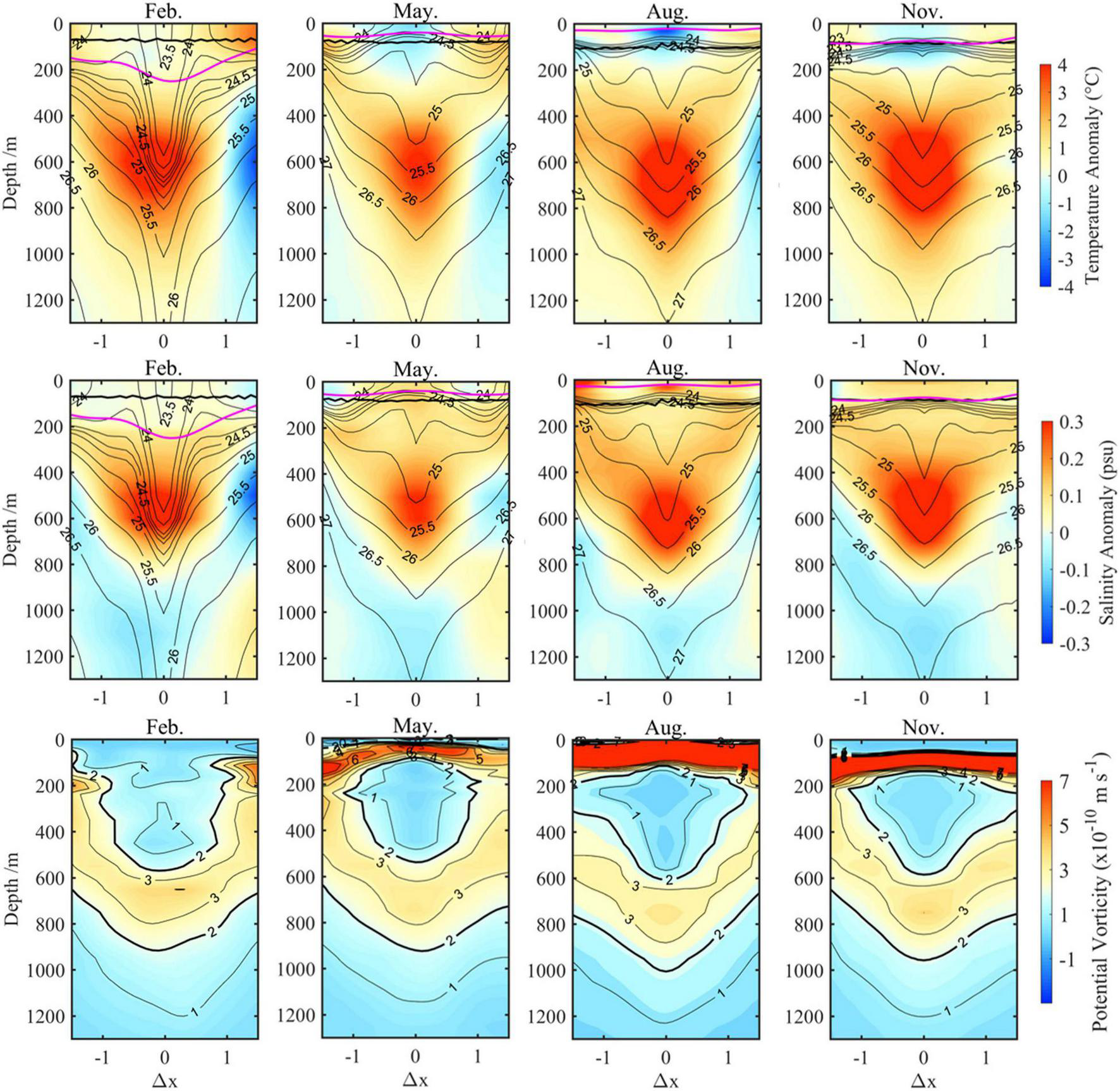 Composite monthly vertical sections of SSAE in February, May, August, and November during the LM path period. Top-to-middle rows show zonal sections of temperature anomalies (color, unit: °C), salinity anomalies (color, unit: psu), and potential density (contour, unit: kg m–1). The magenta lines indicate the MLD, and the black lines indicate the base of ZEU; the bottom row shows the potential vorticity (color and contour, unit: m s–1).