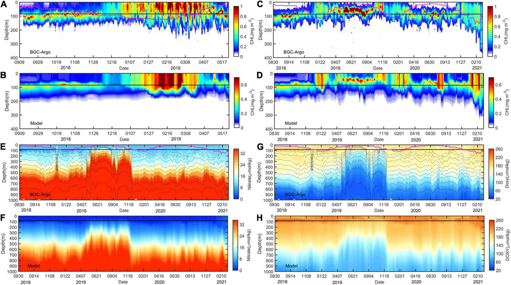 Comparison of time series of the modeled parameter (A–D) CHL (mg m–3), (E,F) NO3 (μmol kg–1) and (G,H) DO (μmol kg–1) with data recorded by BGC-Argo floats in the region south of Japan from 2018 to 2021. The black dashed lines in (E,G) are potential density contours. The magenta lines indicate the MLD, and the black lines indicate the base of ZEU.
