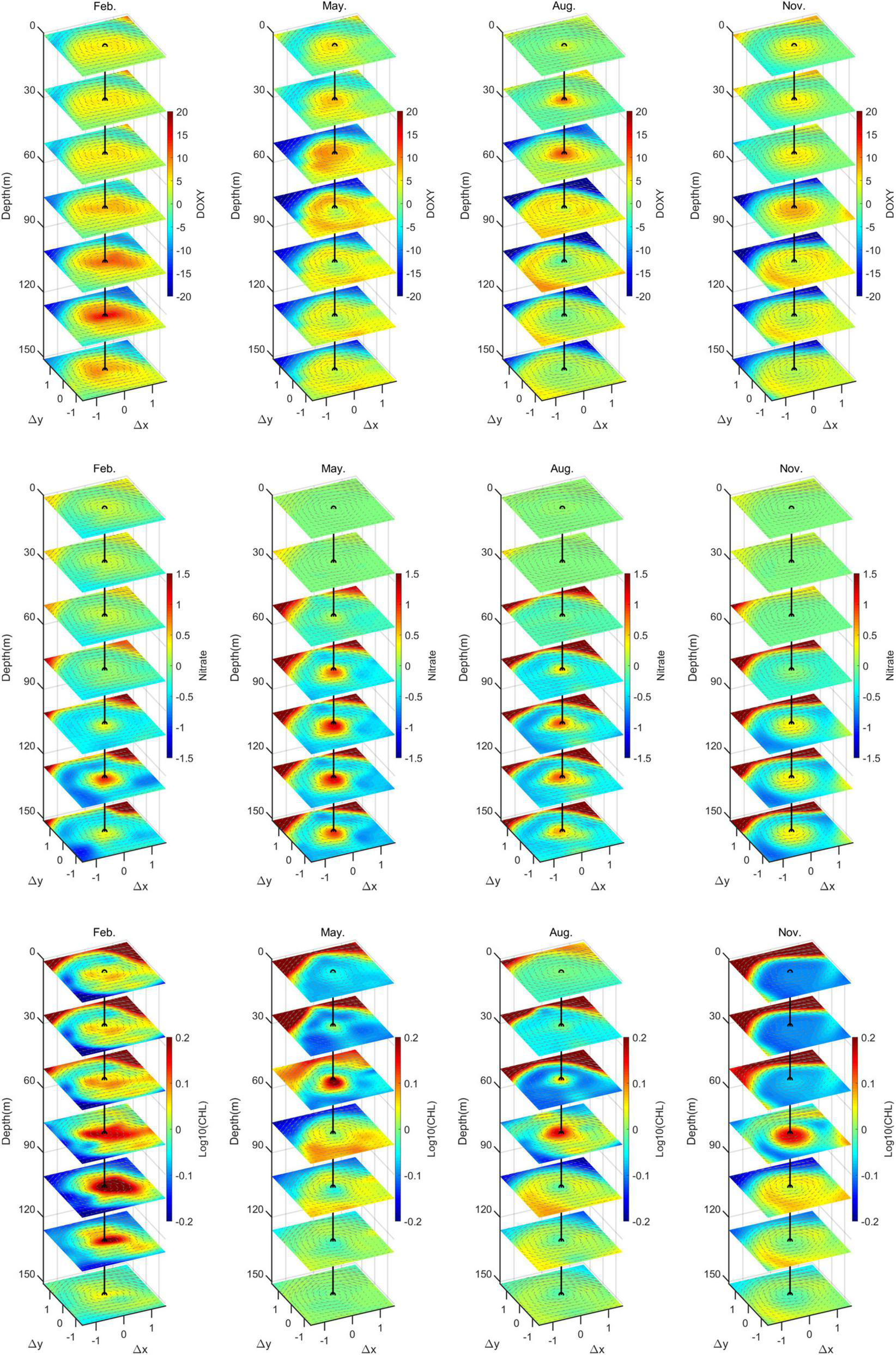 Composite three-dimensional anomaly structures of SSAE in February, May, August and November. From the top to the bottom, the rows show the structures of CHL (mg m–3), NO3 (μmol kg–1), and DO (μmol kg–1).
