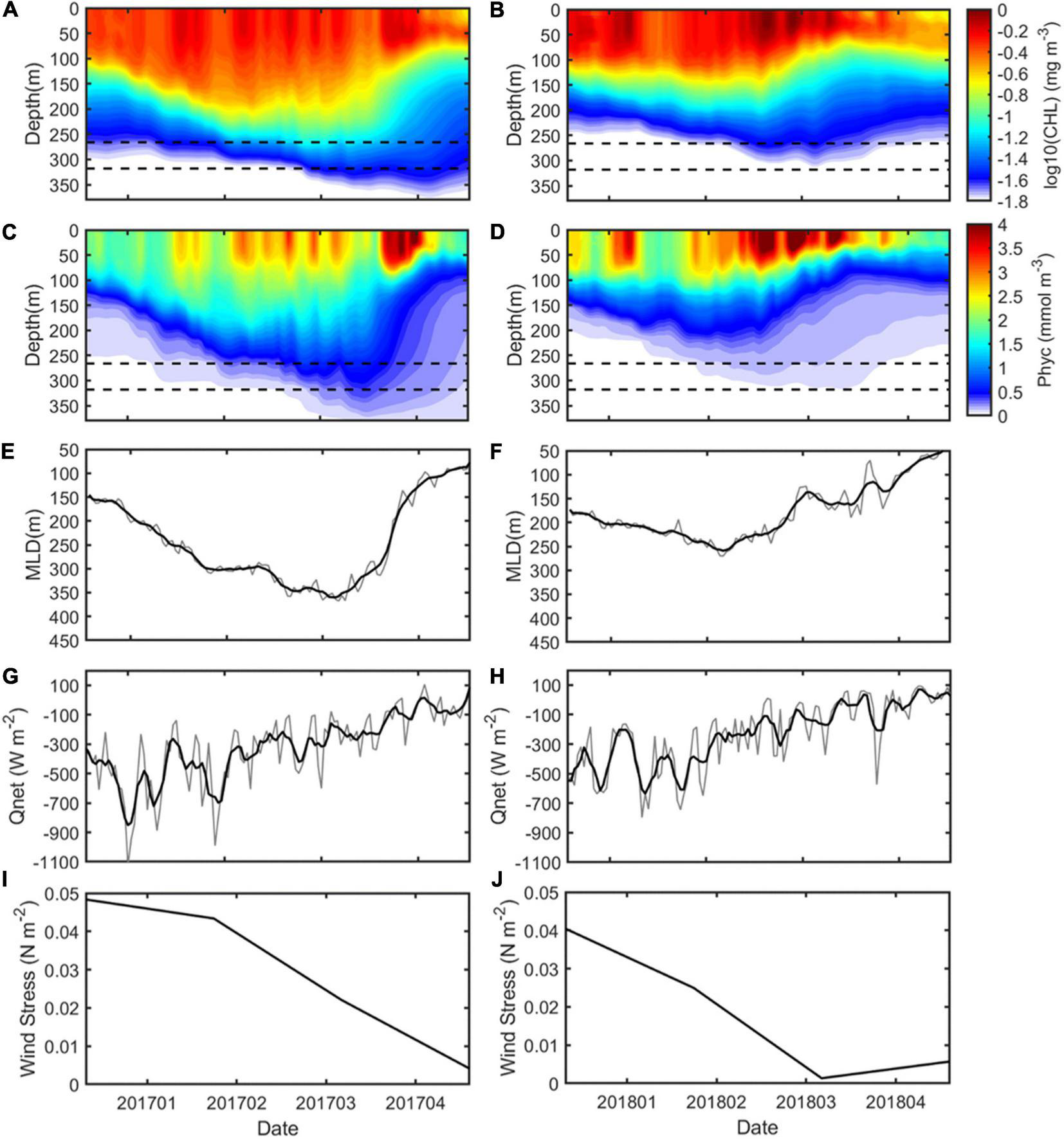 Time series of regionally averaged CHL, total phytoplankton (Phyc), MLD, Qnet, and wind stress in 2017 (A,C,E,G,I) and 2018 (B,D,F,H,J). The dotted lines in panels (A–D) represent depths at 266 m and 318 m.