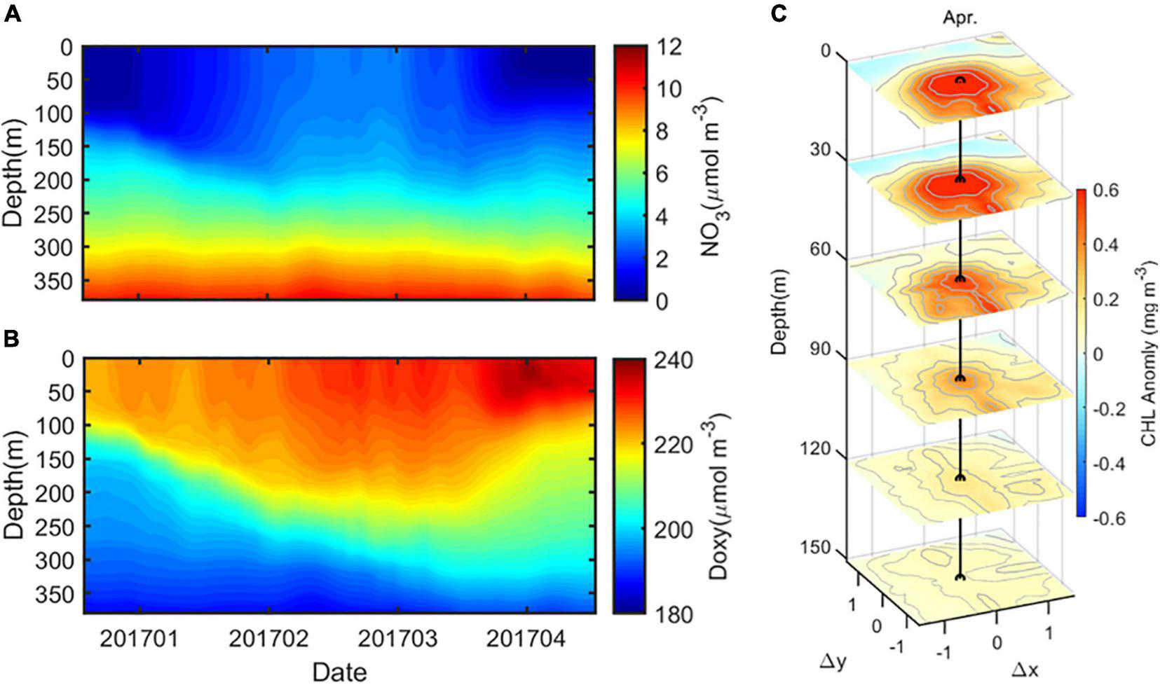 Time series of (A) NO3 and (B) DO averaged in 1.5 times radius of the SSAE in the winter of 2017, and (C) the composite three-dimensional CHL anomaly structure of SSAE in April 2017.