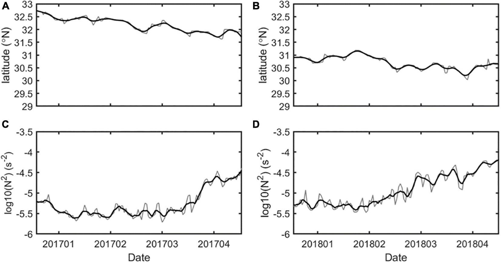 Time series of the main axis of Kuroshio in its southernmost position and regionally averaged (132°−140°E and 28°−35°N) log10 transformed Brunt-Vaisala frequency squared in 2017 (A,C) and 2018 (B,D). The black lines represent 10-day smoothed curves.