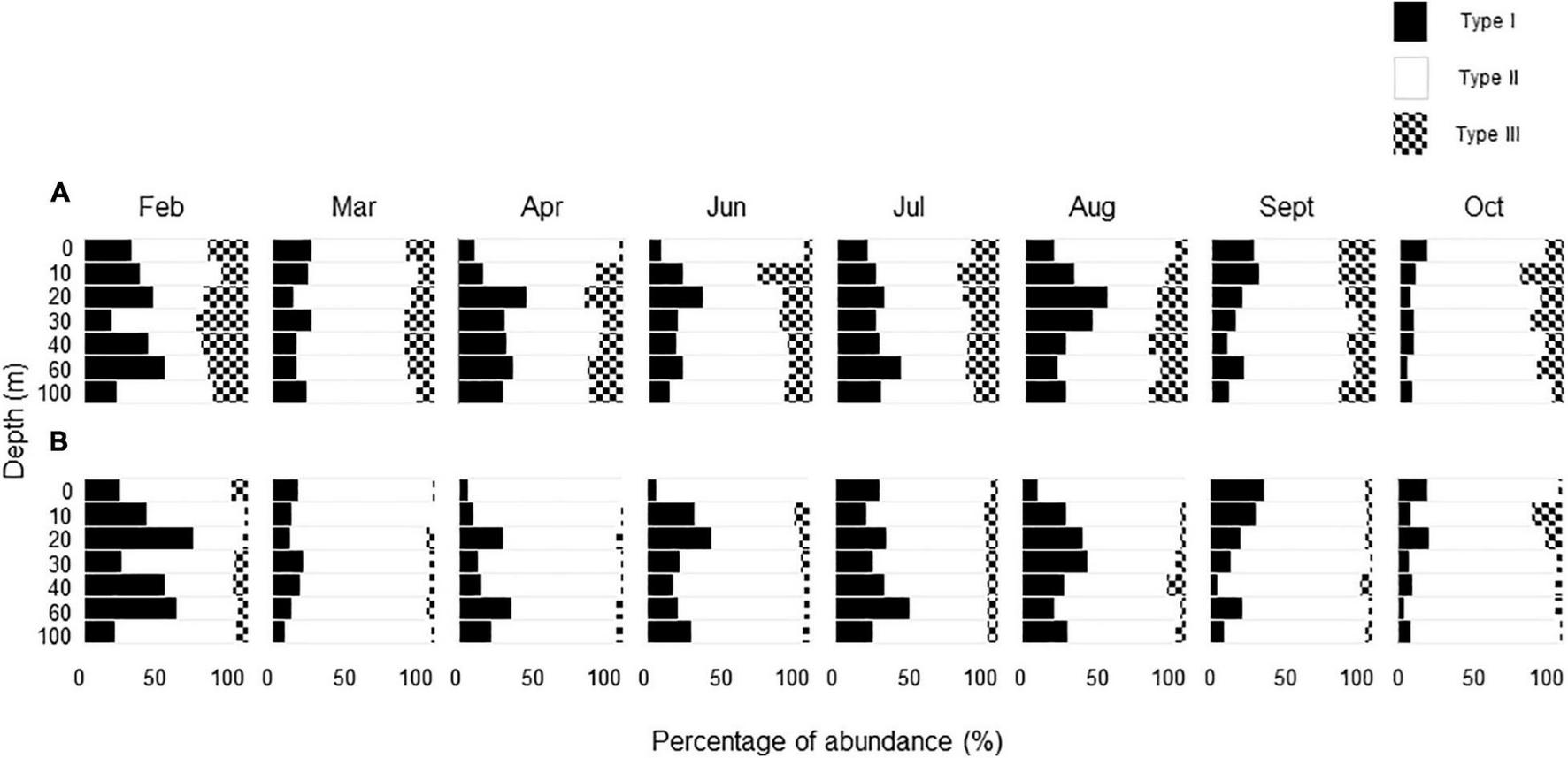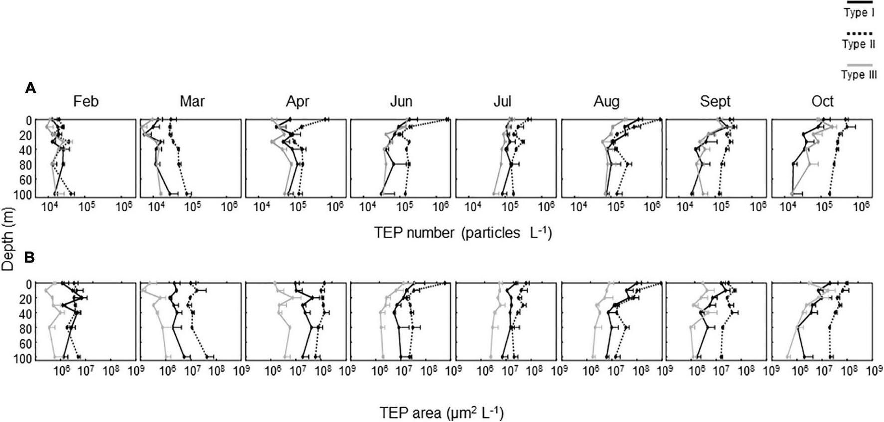Regardless of depth and throughout the investigation period, Type II TEPs generally dominated the TEP samples in terms of area, with some exceptions (Figures 2A,B, 3A,B). A notable exception was observed in February, when Type I TEPs contributed substantially to the total TEP area (Figure 2A). Relatively high contributions (5–43%) of Type I TEPs, in terms of area, were also observed during the stratification period between June and September. Type III TEPs contributed significantly to the total TEP abundance in terms of number; the maximum contribution for each month varied in the range of 19–34% (Figure 3A). However, they did not make much of a contribution in terms of area because of their small size (see below) (Figure 3B).