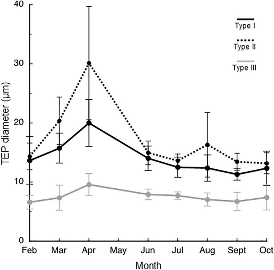 Seasonal changes in the diameter of transparent exopolymer particle (TEP) types. Means of the data collected at different depths are presented with errors (standard deviations, n = 7).