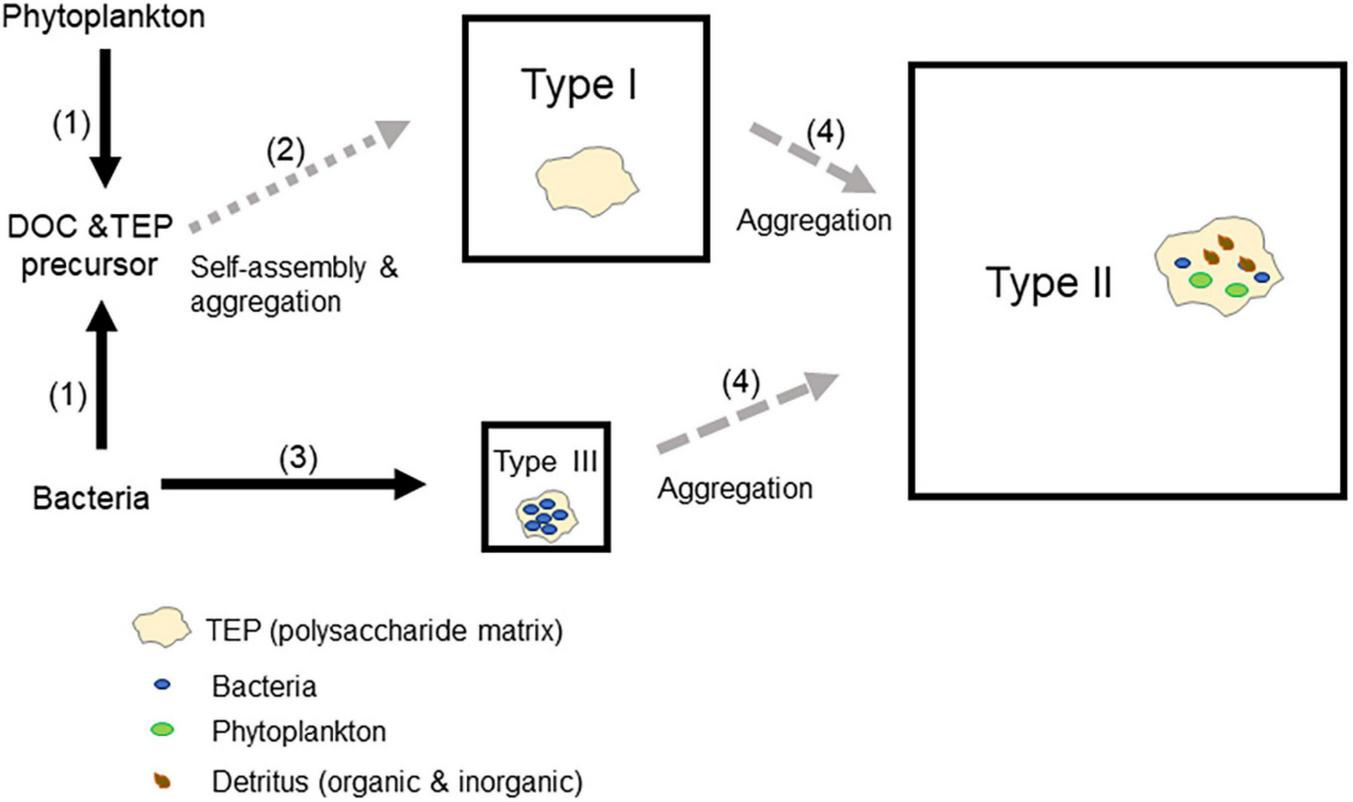 Important areas for future research include elucidation of the biogeochemical role of each type of TEP in marine systems. Currently, there are divergent views on the role of TEPs in the transfer of carbon and pollutants, such as microplastics, in marine environments. One view emphasizes that TEPs facilitate particle aggregation and enhance downward transport of materials, especially when TEPs are aggregated with dense particles (ballasts) (Passow, 2002a; Mari et al., 2017). The other perspective stresses that TEPs are porous and less dense and enhance the retention and ascending flux of TEPs in the upper water (Azetsu-Scott and Passow, 2004; Jennings et al., 2017; Mari et al., 2017). Although the current model generally assumes TEPs to be a homogeneous pool (Passow, 2002a; Wurl et al., 2011; Mari et al., 2017; Nagata et al., 2021), TEPs in fact consist of distinctive and interacting pools of TEP subgroups, as revealed by the present study (Figure 6). Models assuming TEPs to be a homogeneous pool might be compromised if different TEP subgroups behave differently in transfer processes. Therefore, our results highlight the importance of investigating TEP internal dynamics and controls to improve our understanding of the role of TEPs in carbon and pollutant transfer in marine environments.