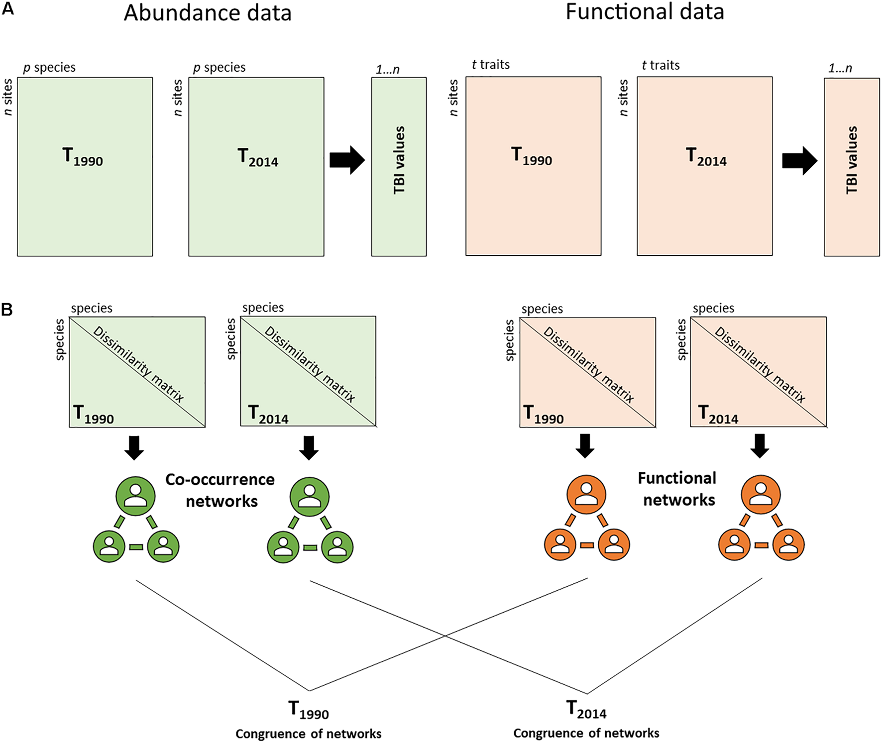 Methodological approach (A) comparing temporal taxonomic and functional beta diversity (TBI) for two time periods, 1990 and 2014, (B) assessing the congruence of the co-occurrence and functional networks to determine the main assembly rules of benthic communities for 1990 and 2014.