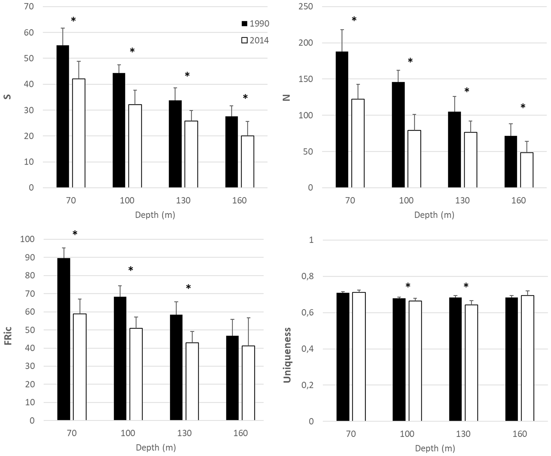 Temporal change in alpha diversity indices (S: richness, N: total abundance, FRic: Functional richness and Uniqueness) between 1990 and 2014. Black bars indicate samples collected in 1990 and white bars in 2014. Error bars indicate standard deviation. Asterisks indicate statistically significant differences at p < 0.05.