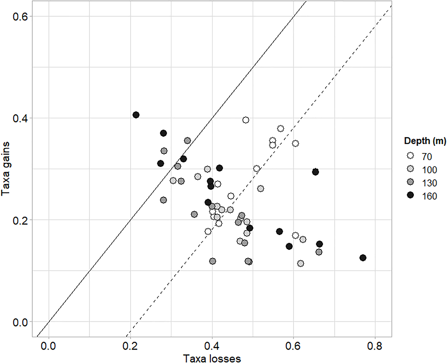 To better interpret possible changes in functional TBI, taxonomic TBI was also computed. Bray-Curtis dissimilarity was performed on log-transformed abundance data and used as input for computing taxonomic TBI. Taxonomic TBI was decomposed into β diversity explained by either species temporal losses or temporal gains. The significance of the processes (losses or gains) dominating and causing community composition changes between 1990 and 2014 was tested using parametric paired t-tests (Legendre, 2019).