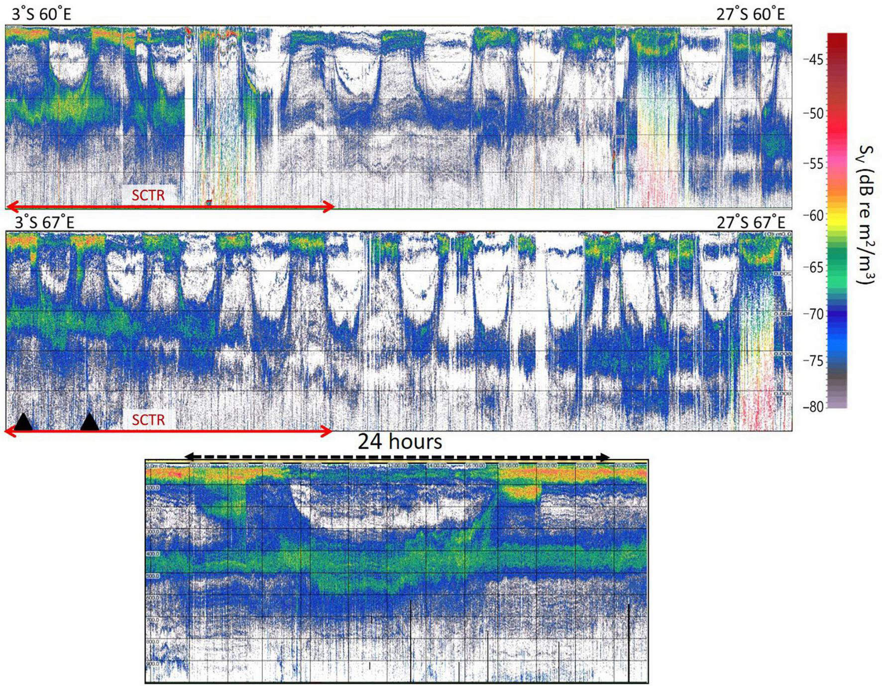 Diurnal migration pattern of acoustic scatterers. Clear diurnal migrations are visible in 200–800 m depth. Diurnal migration of 400–800 m in the SCTR (marked with red arrows) was clearer and shallower than that in the non-SCTR. The top echogram starts from the latitude of 3°S to 27°S in 60°E of longitude. The middle echogram begins from 3°S to 27°S in 67°E. A 24 h echogram (bottom) was recorded on May 2 of 2019 and was derived from two black triangles of the middle echogram. The horizontal lines every 200 m depth are shown in all echograms.