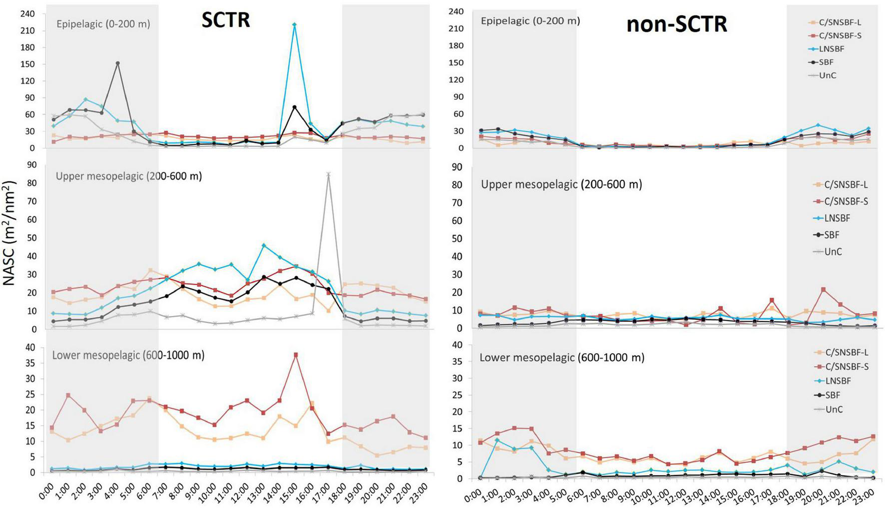 The NASC values in the categorized acoustic scatterers and depth layers were higher in the SCTR than in the non-SCTR region, except for LNSBF in LM (Figure 4). In the SCTR, the highest peak was LNSBF at 15:00 (220.9 m2/nm2), and the second-highest peak was SBF at 04:00 (152 m2/nm2) in E. In UM, the highest peak was Unc at 17:00 (84.9 m2/nm2), while that in LM, it was C/SNSBF-S at 15:00 (37.7 m2/nm2). In the non-SCTR region, the highest peak in E was C/SNSBF-S at 20:00 (40.5 m2/nm2), that in UM was C/SNSBF-S at 20:00 (21.6 m2/nm2), and that in LM was C/SNSBF-S at 02:00 (15.1 m2/nm2). In LM, C/SNSBF was dominant in both SCTR and non-SCTR regions, regardless of time. Overall, in the SCTR, high NASC in E was observed at night rather than during the daytime, while high NASC in UM and slightly high NASC in LM were found in the day rather than at night. In the non-SCTR region, high NASC in E was observed at night rather than during the day and high NASC in UM and LM were found at night. In particular, in E, LNSBF and SBF were observed in both the SCTR and non-SCTR regions. In UM, C/SNSBF and LNSBF appeared high, and in LM, high C/SNSBF occurred in both the regions. Furthermore, the Mann-Whitney U-test was performed to determine the statistical difference based on day and night for acoustic categories (C/SNSBF-S, C/SNSBF-L, LNSBF, SBF, and UnC) and among depth layers (E, UM, and LM) in SCTR and non-SCTR. The results showed a significant difference between day and night except for C/SNSBF-S in UM in the SCTR [U(Nday = 7,637, Nnight = 9,091) = 34,324,863.00, p > 0.05] and C/SNSBF-S in E [U(Nday = 1,539, Nnight = 2,812) = 2,144,895.00, p > 0.05) and UM [U(Nday = 4,702, Nnight = 5,839) = 13,426,225.50, p > 0.05] in the non-SCTR region.