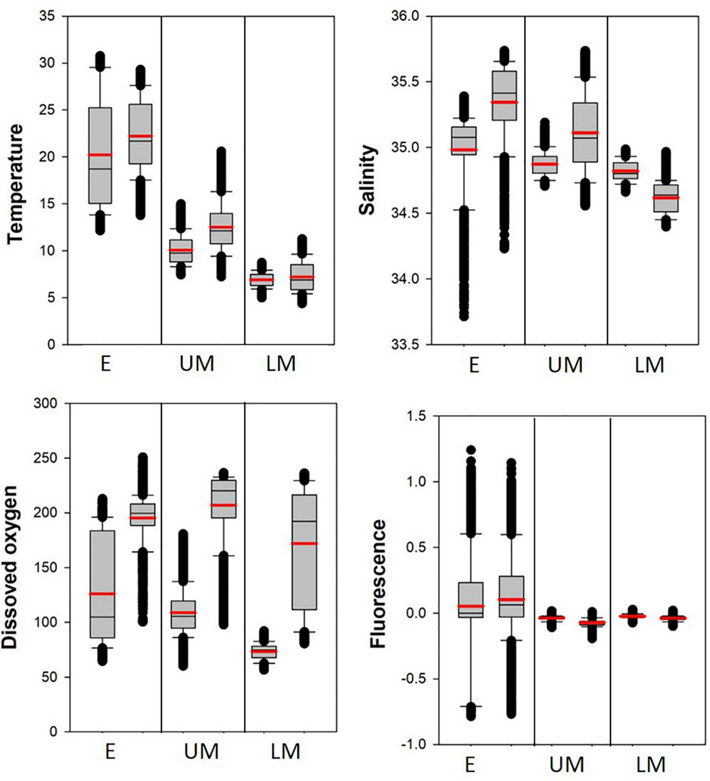 The marine environmental properties of the depth layers were compared between the SCTR and non-SCTR regions using boxplots (Table 3 and Figure 6). In the E category, the mean and SD values of the temperatures were 20.2 ± 5.8°C (SCTR) and 22.2 ± 3.8°C (non-SCTR). In UM, the minimum and maximum values were 7.5 and 15.0°C (SCTR) and 7.3 and 20.6°C (non-SCTR), respectively. In LM, the first and third quartiles were 6.3 and 7.5°C (SCTR), and 5.9 and 8.5°C (non-SCTR), respectively. Overall, colder waters were found in the SCTR than in the non-SCTR region. In E, the mean and SD values of salinity were 35.0 ± 0.3 psu (SCTR) and 35.3 ± 0.3 psu (non-SCTR). Many lower outliers associated with fresher water near the surface were observed in both the SCTR and non-SCTR regions. For the salinity of the UM, the mean and SD values were 34.9 ± 0.1 psu (SCTR) and 35.1 ± 0.3 psu (non-SCTR). In LM, the mean and SD values were 34.8 ± 0.1 psu (SCTR) and 34.6 ± 0.1 psu (non-SCTR). Overall, fresh water with slightly lower salinity was observed in E and UM of the SCTR than in those of the non-SCTR region. For the dissolved oxygen of E, the interquartile range in the SCTR (85.8–183.5 μmol/kg) was much wider than that of the non-SCTR region (188.5–208.2 μmol/kg), as the oxycline, where dissolved oxygen sharply varies vertically, was observed within the E in the SCTR and within the LM in the non-SCTR region. For the dissolved oxygen of the UM, the mean and SD values were 108.9 ± 21 μmol/kg (SCTR) and 207 ± 31.5 μmol/kg (non-SCTR). However, for the dissolved oxygen of the LM, the mean and SD values were 73.4 ± 7.4 μmol/kg (SCTR) and 171.8 ± 52.1 μmol/kg (non-SCTR). The interquartile range in SCTR was much narrower than that in the non-SCTR region in the LM, where the oxycline was present. Overall, water with lower dissolved oxygen levels was observed in the SCTR than in the non-SCTR region. For the chlorophyll fluorescence of E, the mean and SD values were 0.05 ± 0.39 v and 0.10 ± 0.36 v for the SCTR and non-SCTR regions, respectively. Overall, a slightly lower fluorescence was observed in the SCTR than in the non-SCTR region. In summary, colder and more fresh water with lower dissolved oxygen was found in the SCTR than in the non-SCTR region, with no significant difference in chlorophyll fluorescence, except for salinity in the LM layer.