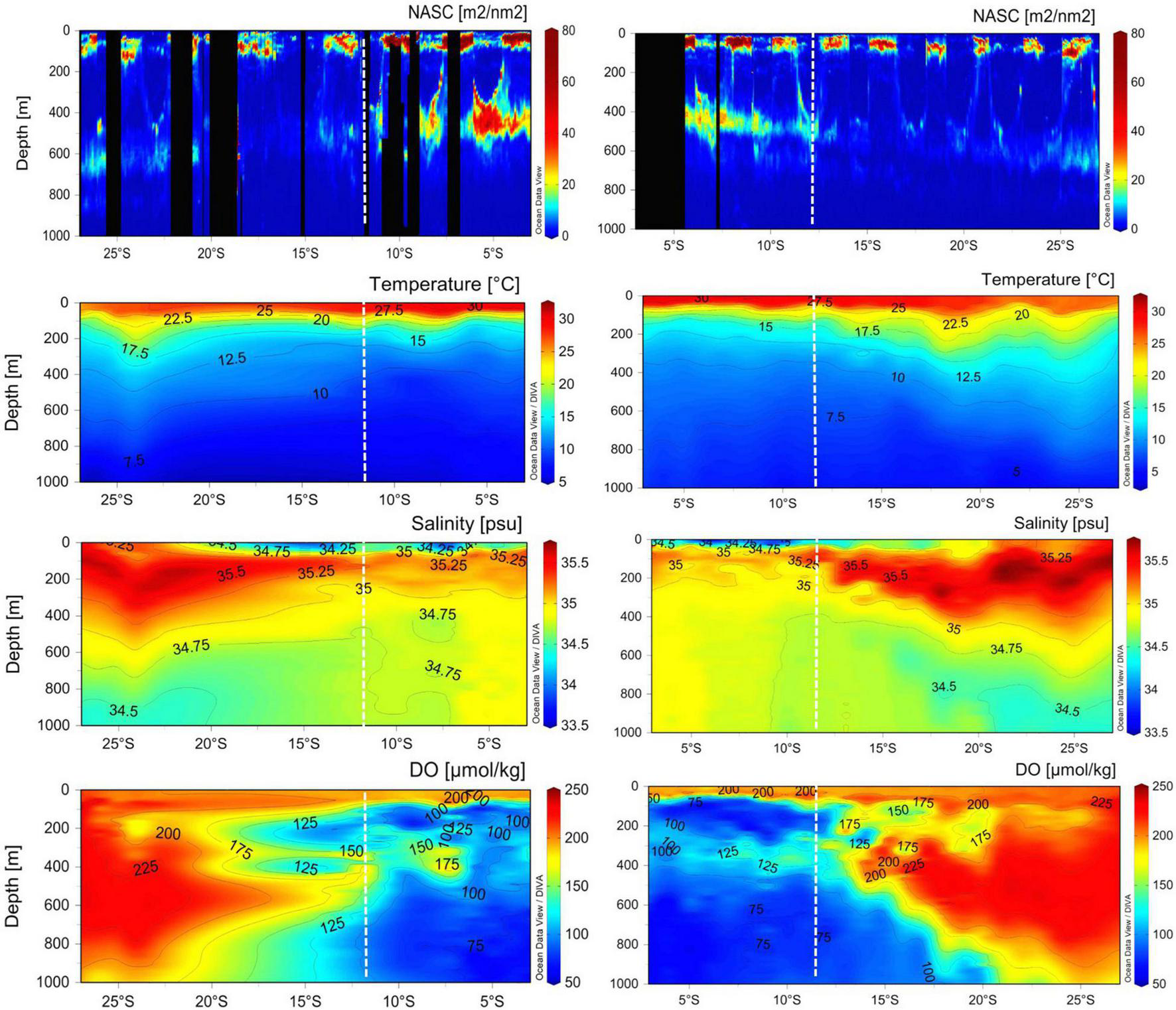 Acoustic data were analyzed using Echoview (ver. 11, Echoview Software Pty. Ltd.). Acoustic data above 6 m were excluded from further analysis to eliminate surface noise from rough seas. Then, a feature of the “threshold offset” in Echoview was employed to remove noise signals by ring down and surface bubbles. The seabed line was set as 1,000 m and then manually inspected and modified when the seabed depth was shallower than 1,000 m. Acoustic data below the seabed line were excluded from further analysis. The signal-to-noise ratio was improved by applying noise-removal algorithms. The combination of impulse noise and transient noise removal algorithms identified higher acoustic scattering values in a given domain than the surrounding samples (Ryan et al., 2015; Echoview, 2021). To remove the transient noise at 18 kHz, samples (smoothed value) that exceeded the transient noise threshold (7 dB) were deemed to represent transient noise and were set to the 75th percentile of samples in the context window. The cleaned echograms at 18 and 38 kHz were then exported to the Echoview data file format (.evd), and the .evd files were added as raw data files in Echoview. This expedited the data processing. The minimum threshold was set to −80 dB. The thematic map, which presents the horizontal distributional map of acoustic scatterers using the nautical area scattering coefficient (NASC, m2/nm2), which indicates the acoustic scattering strength of a nautical mile squared over a defined depth, was exported in a cell (5 nm × 1,300 m) in the cleaned 38 kHz echogram for visualization. The cell is a region or a division of echogram data into a depth layer and an interval of time or distance. The NASC values using a cell size (10 nm × 10 m) in the cleaned 38 kHz echogram were exported to display the vertical distribution of acoustic scatterers. To examine the DVM of acoustic scatterers, the rising and falling times of the echo signals on the original SV echogram (uncleaned) at 38 kHz were marked. The rising and falling times of the echo signals could be observed, although there was noise. A time and date website provided sunrise and sunset periods in Seychelles (Time and Date, 2021). To investigate the relationship between the acoustic scatterers and marine environmental properties, the echo signals in the cleaned 38 kHz echogram were selected based on the locations of the CTD stations, and then the NASC values on the selections were exported. The size of the selection was approximately 4,000 m horizontally and 1 m vertically. The NASC values at 60°E and 67°E longitude were exported to a cleaned 38 kHz echogram with a cell (30 min × 5 m) to visualize the acoustic scatterers with environmental properties.