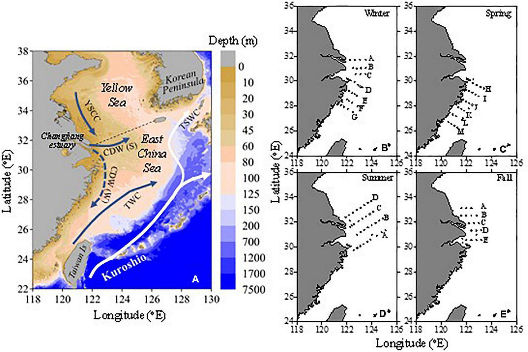Topographic map of the East China Sea (A) and the distributions of the sampling stations (B–E). In panel (A), the dashed line separates the East China Sea (ECS) and the Yellow Sea (YS). CDW (S) is the Changjiang Diluted Water in summer; CDW (W) is the Changjiang Diluted Water in winter; YSCC is the Yellow Sea Coastal Current; TWC is Taiwan Warm Current; TSWC is Tsushima Warm Current. In panels (B–E), the letters are the names of the sections.