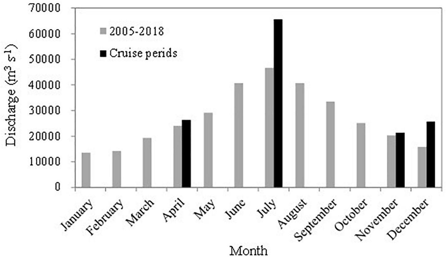 Freshwater discharge of the Changjiang River at the Datong Hydrological Station (Ministry of Water Resources of the People’s Republic of China, http://xxfb.hydroinfo.gov.cn/). The gray bars show the 2005–2018 monthly average discharges, while the black bars show the months of the cruises in this study.
