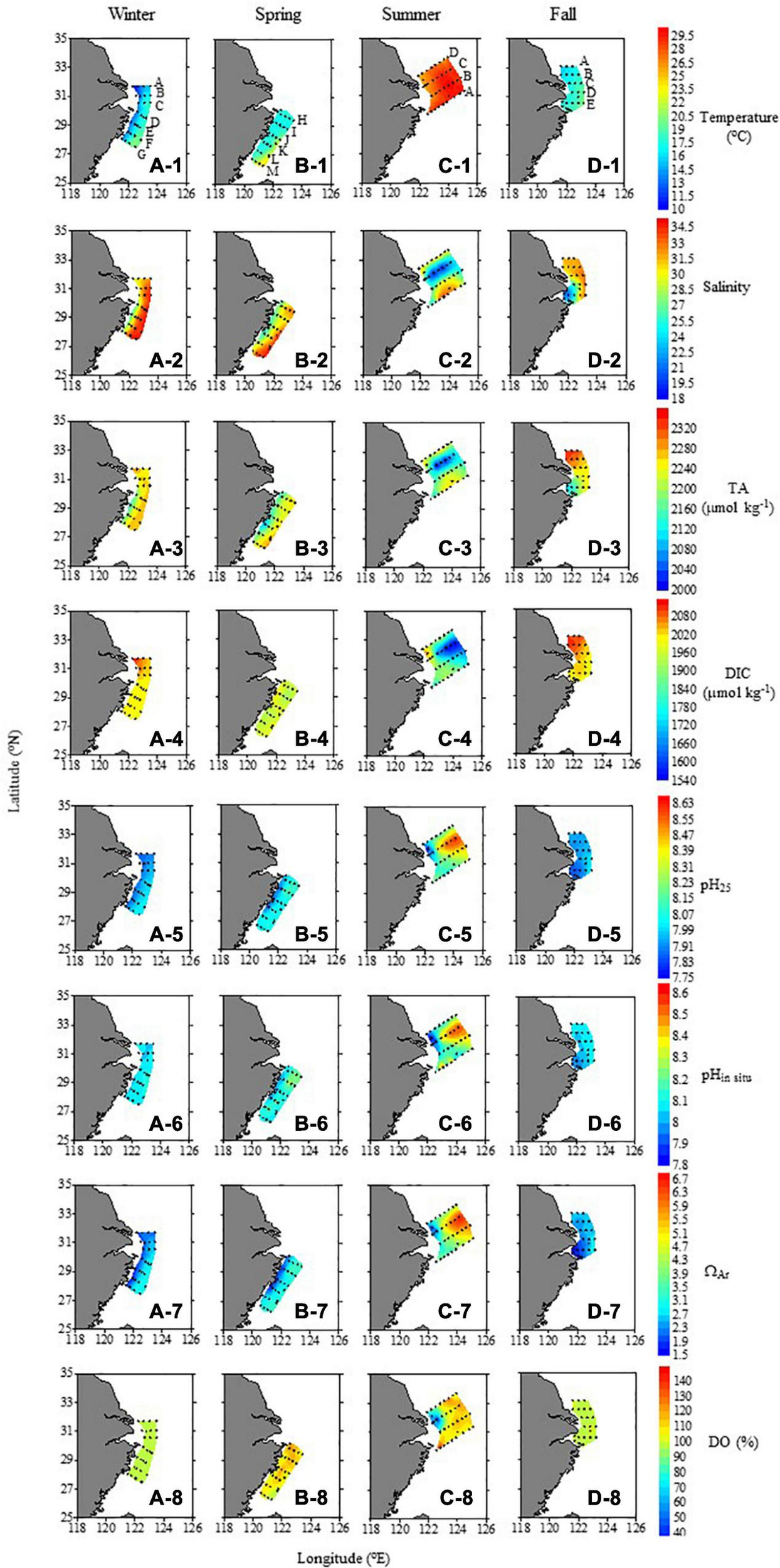 Spatial distributions of temperature, salinity, TA, DIC, pH25, pHin–situ, ΩAr, and DO saturation degree (%) in surface water sampled during different seasons.