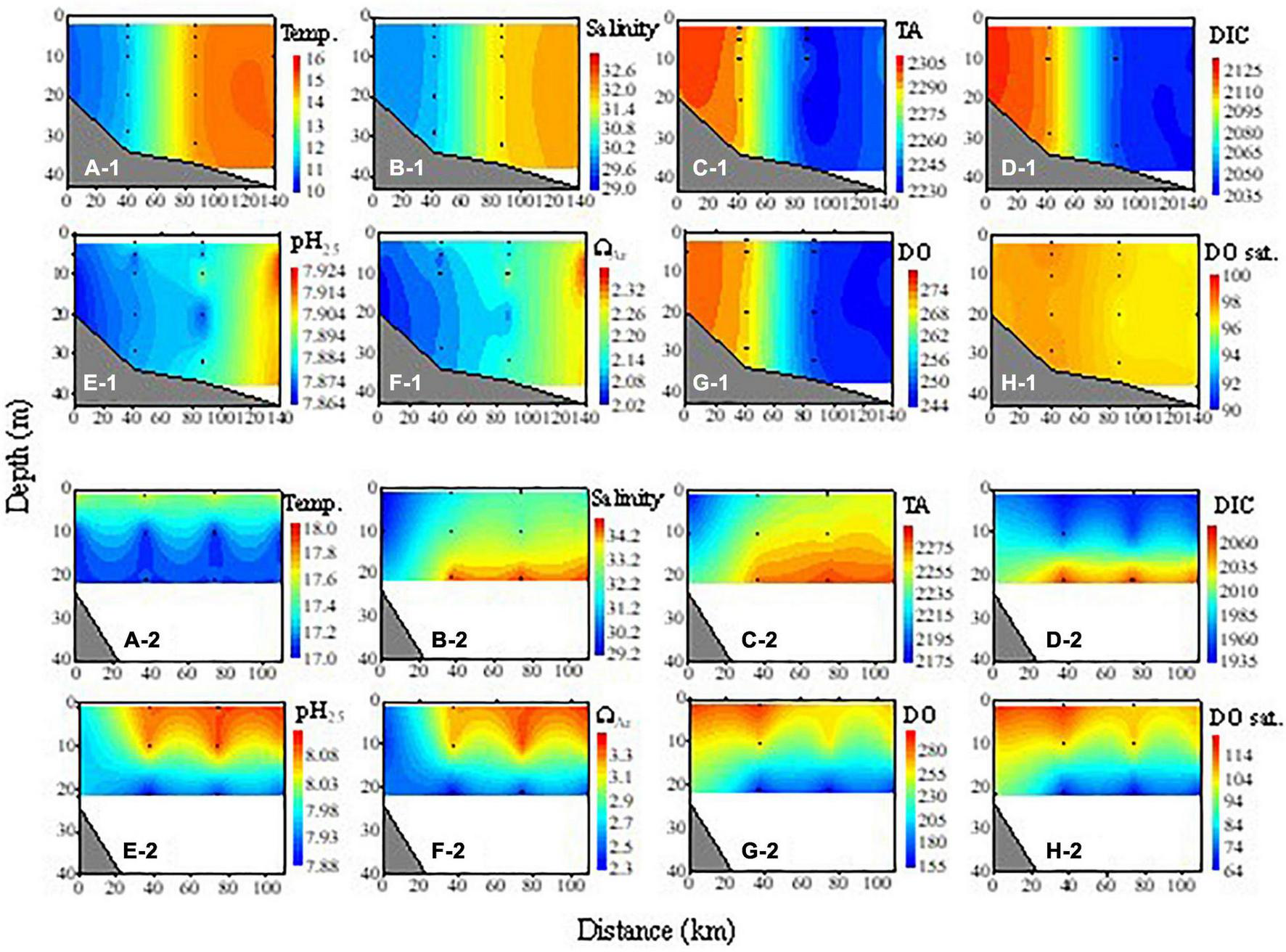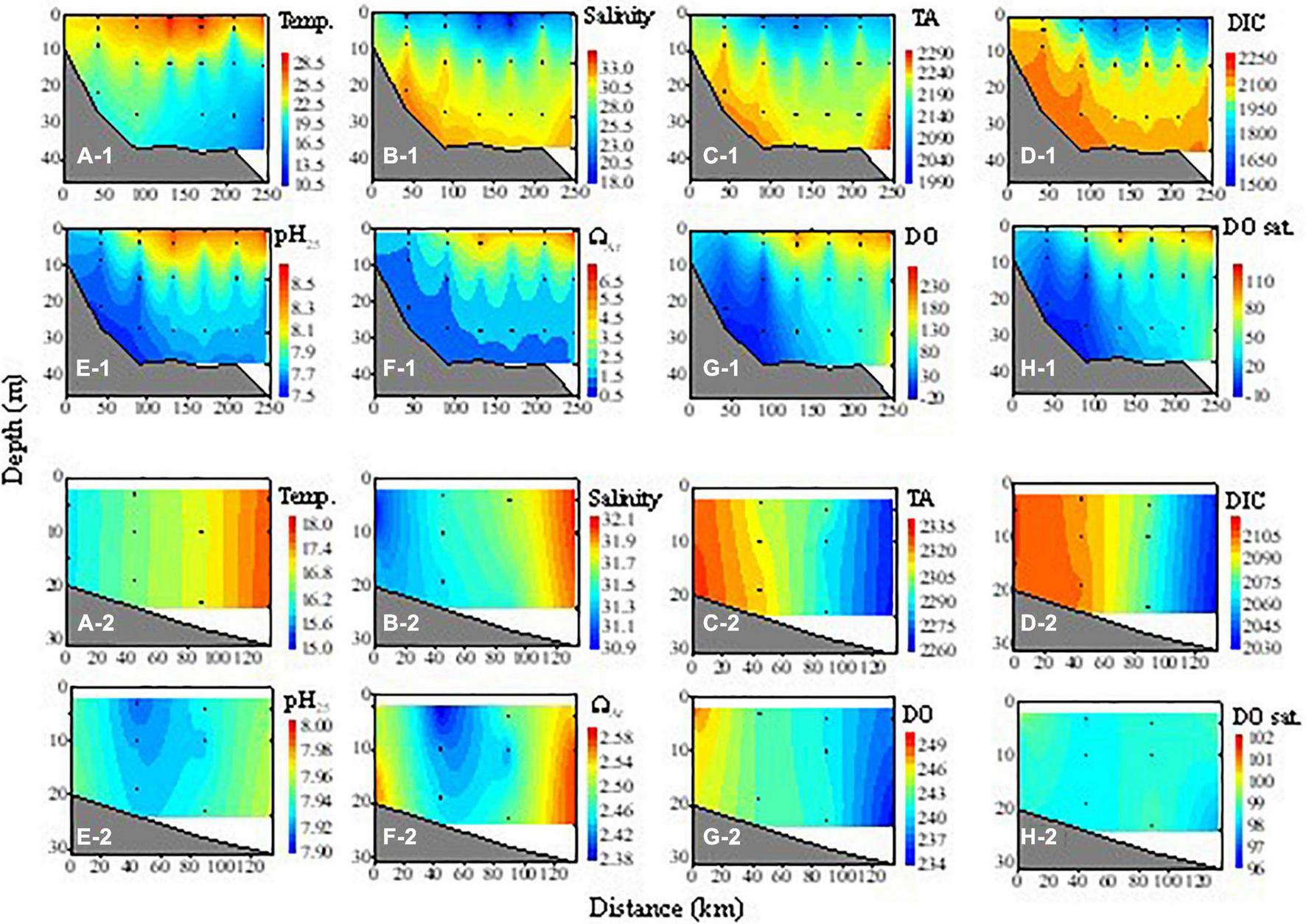 Cross-sectional distributions of temperature (Temp., °C), salinity, TA (μmol kg– 1), DIC (μmol kg– 1), pH25, ΩAr, DO (μmol kg– 1), and DO saturation degree (DO sat., %) along with transect C during the summer cruise (A-1–H-1) and transect B during the fall cruise (A-2–H-2). Distance 0 is the nearshore-most station.