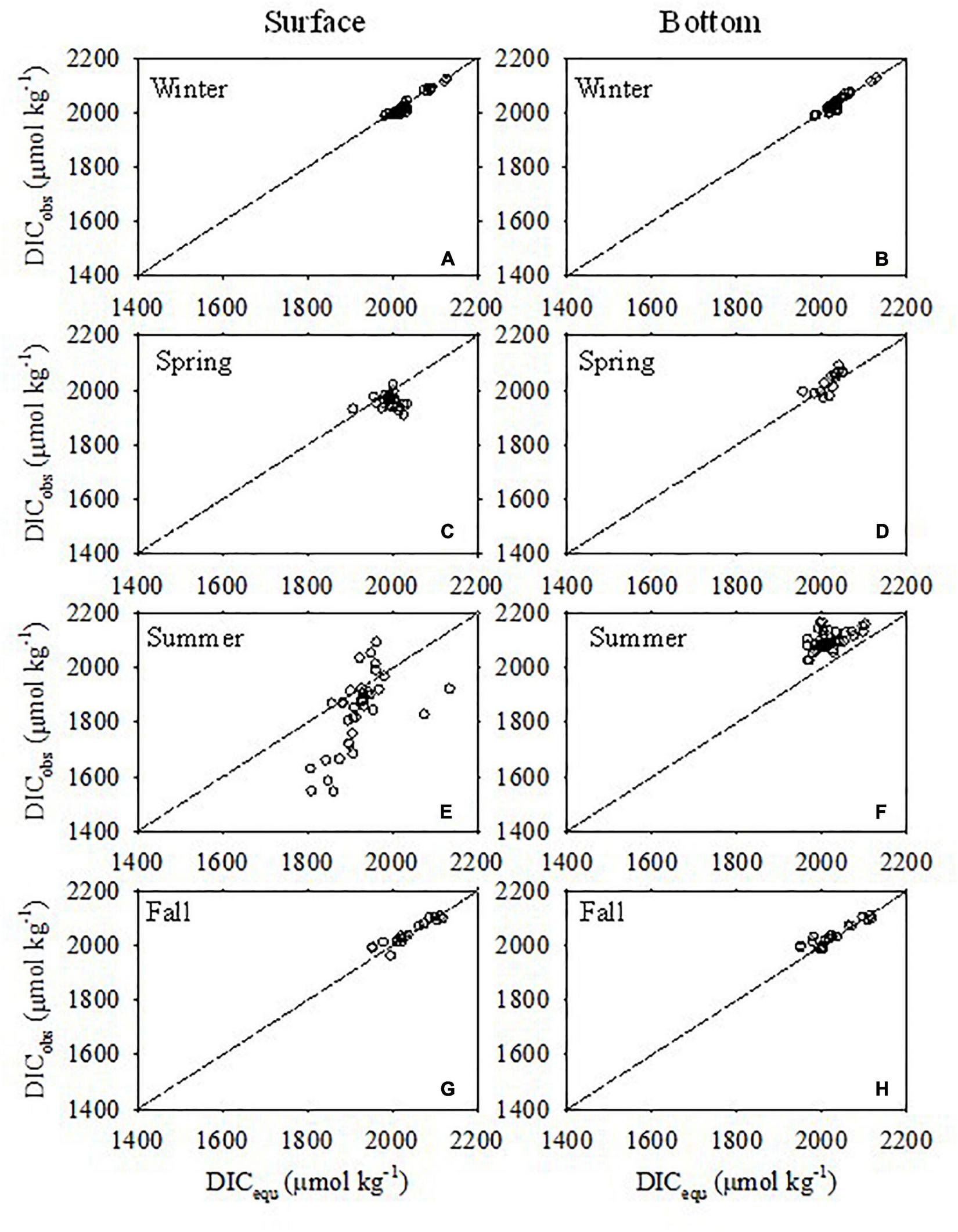 Comparison between observed DIC (DICobs) concentrations and DIC at equilibrium with the atmosphere (DICequ) in surface (A,C,E,G) and bottom (B,D,F,H) waters in winter, spring, summer, and fall. The dotted line represents 1:1.