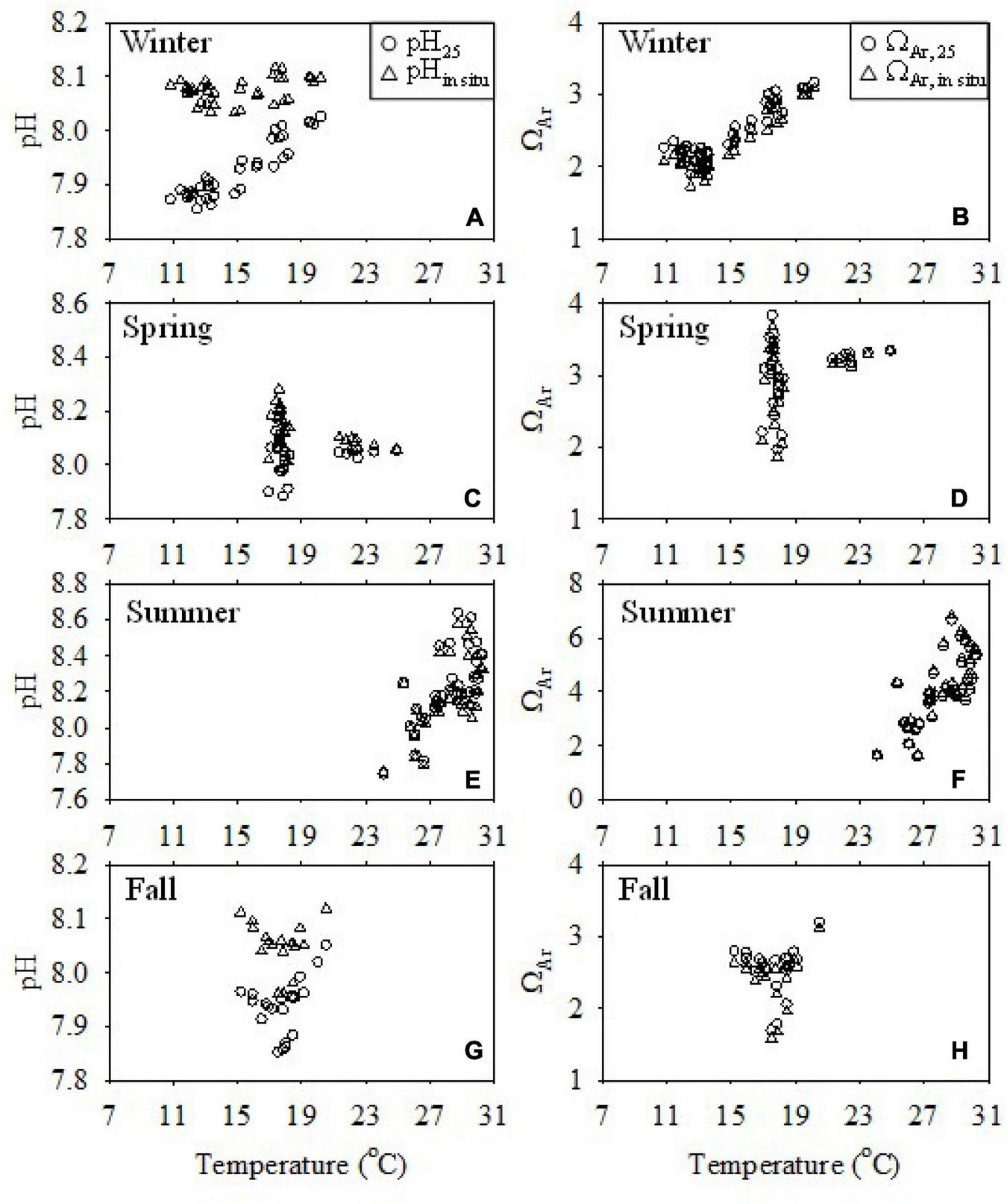 Relationship of pH and ΩAr values at 25°C (pH25 and ΩAr,25) and in situ temperature (pHinsitu and ΩAr) with temperature in the surface water of the ECS shelf in winter (A,B), spring (C,D), summer (E,F), and fall (G,H).