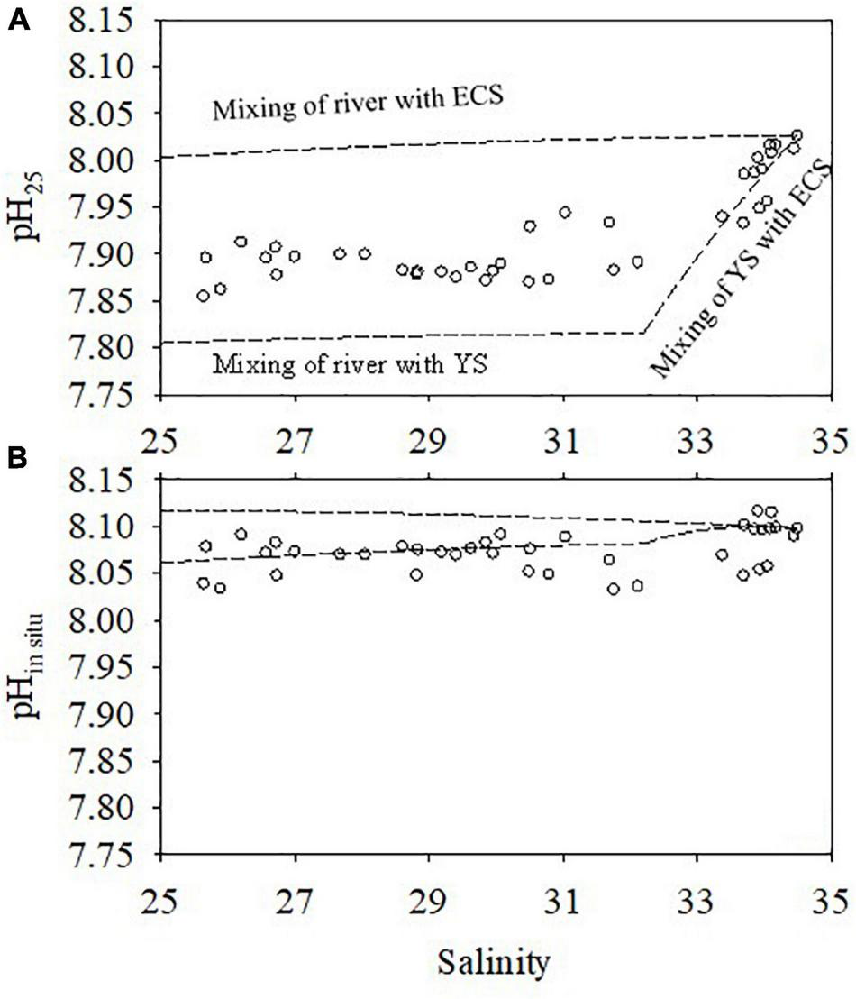Influence of water mixing on pH25(A) and pHinsitu(B) in winter. The dashed lines are the mixing lines and the open circles are the observed pH25 and pHinsitu values. The mixing lines of pH25 were calculated based on the conservative mixing of DIC and TA values; the mixing lines of pHinsitu were calculated based on the conservative mixing of temperature, DIC, and TA.