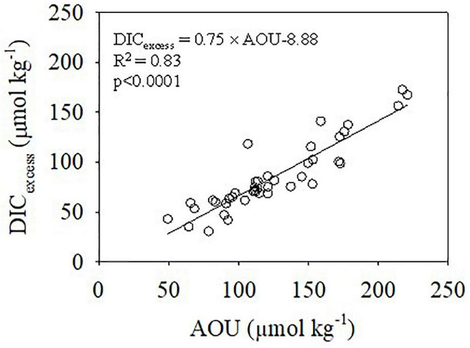 Relationships between DICexcess and AOU in the bottom water in summer. The solid line represents the linear regression.