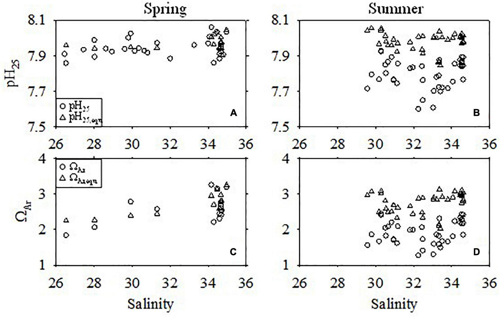 Comparison of pH25 and ΩAr between the observed values and the values at equilibrium with the atmosphere (with subscript “equ”) in the bottom water during warm seasons. (A,C) Spring. (B,D) Summer.