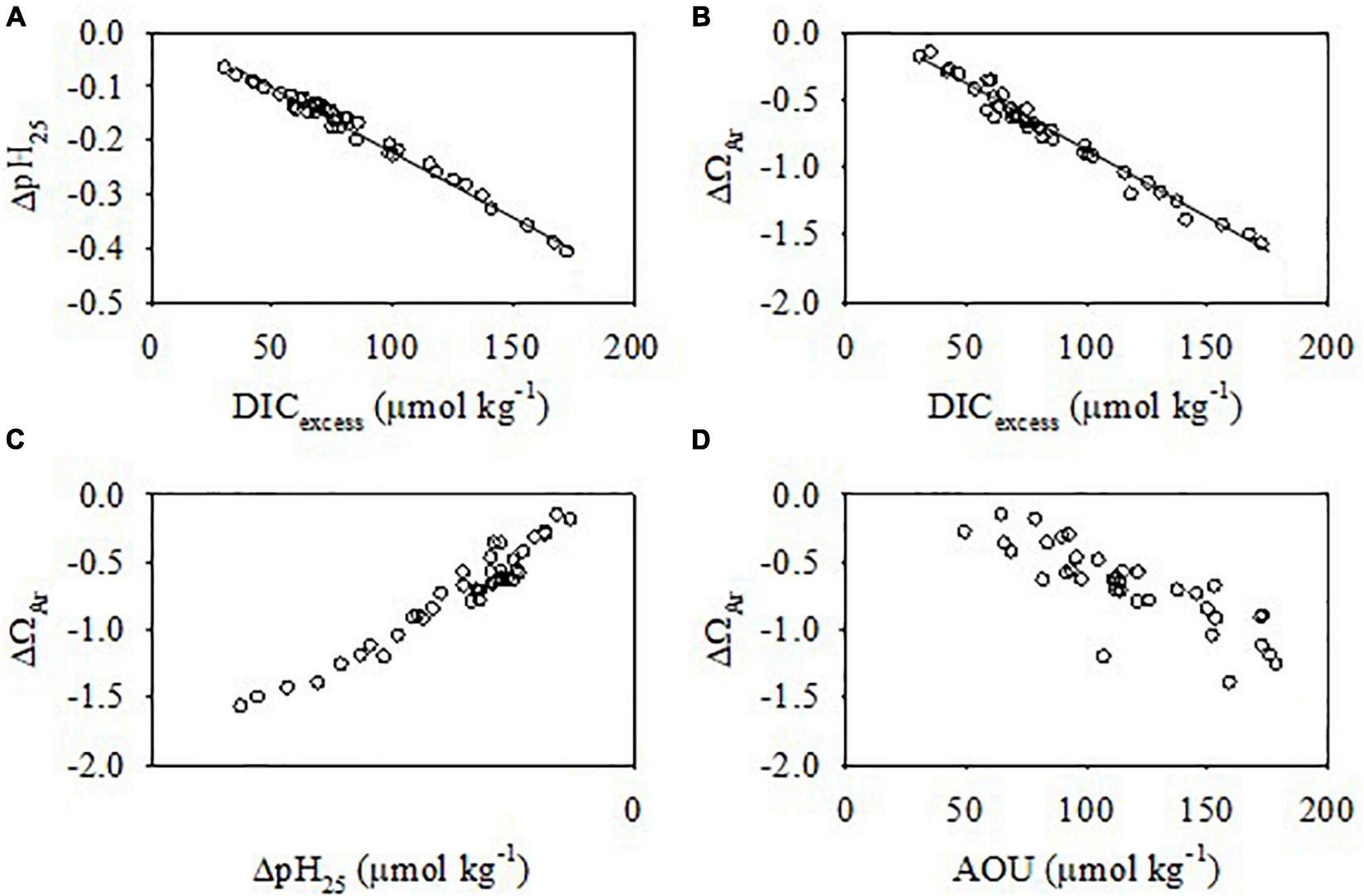 Relationships of ΔpH25 and ΔΩAr with DICexcess(A,B) and ΔΩAr with ΔpH25 and AOU (C,D) in the bottom water in summer. The solid lines represent the linear regressions. The slopes of the linear regressions of ΔpH25 and ΔΩAr with DICexcess were -0.0024 and -0.0101, respectively.