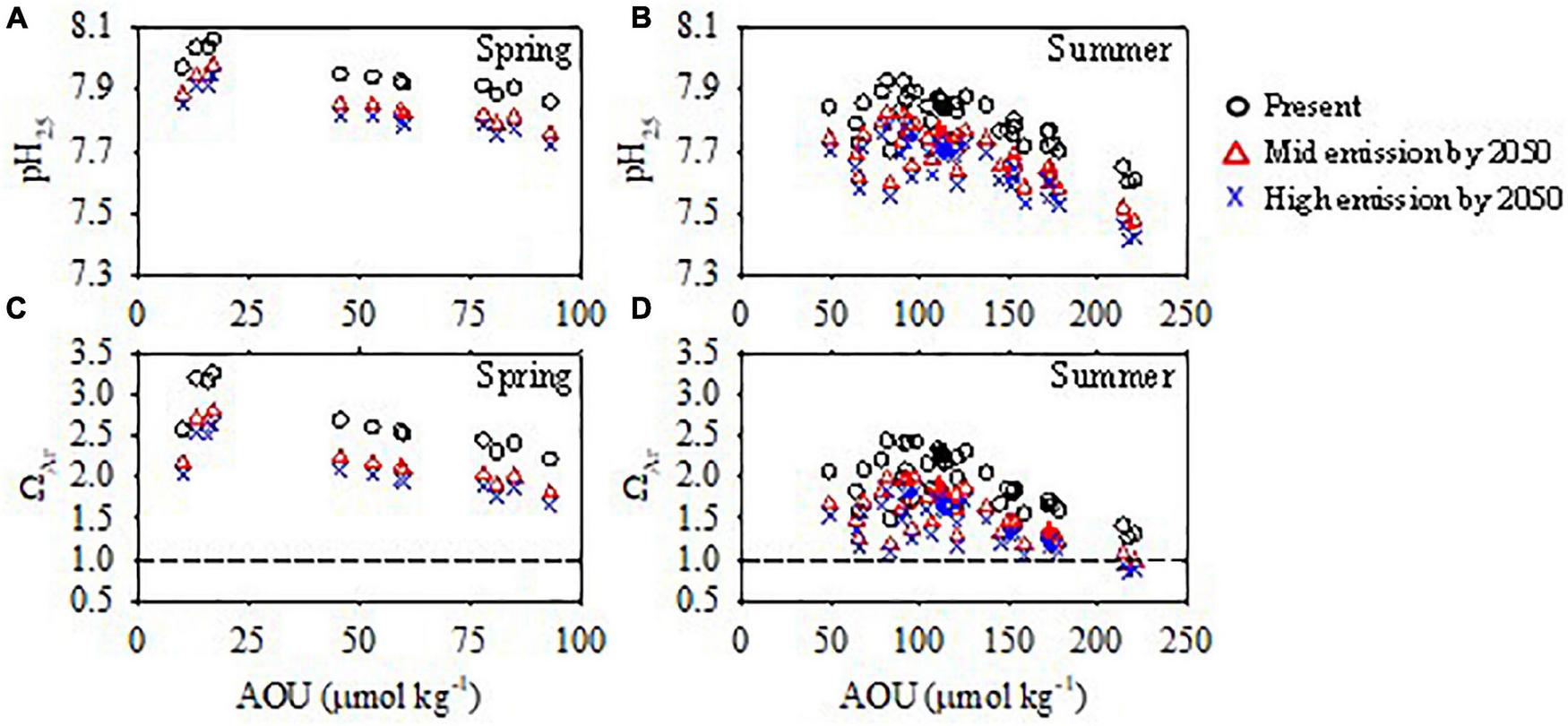 Within the context of global CO2 increases and ocean acidification, ΩAr in the ECS will continuously decrease. Using this information, we can estimate pH25 and ΩAr in ECS shelf bottom water in the near future (by the mid-century) under the influence of the same biogeochemical processes as observed during our surveyed periods.