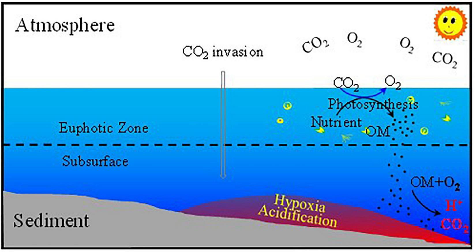 Zhao Y. Liu J. Uthaipan K. Song X. Xu Y. He B. et al (2020). Dynamics of inorganic carbon and pH in a large subtropical continental shelf system: Interaction between eutrophication, hypoxia, and ocean acidification.Limnol. Oceanogr.651359–1379. 10.1002/lno.11393