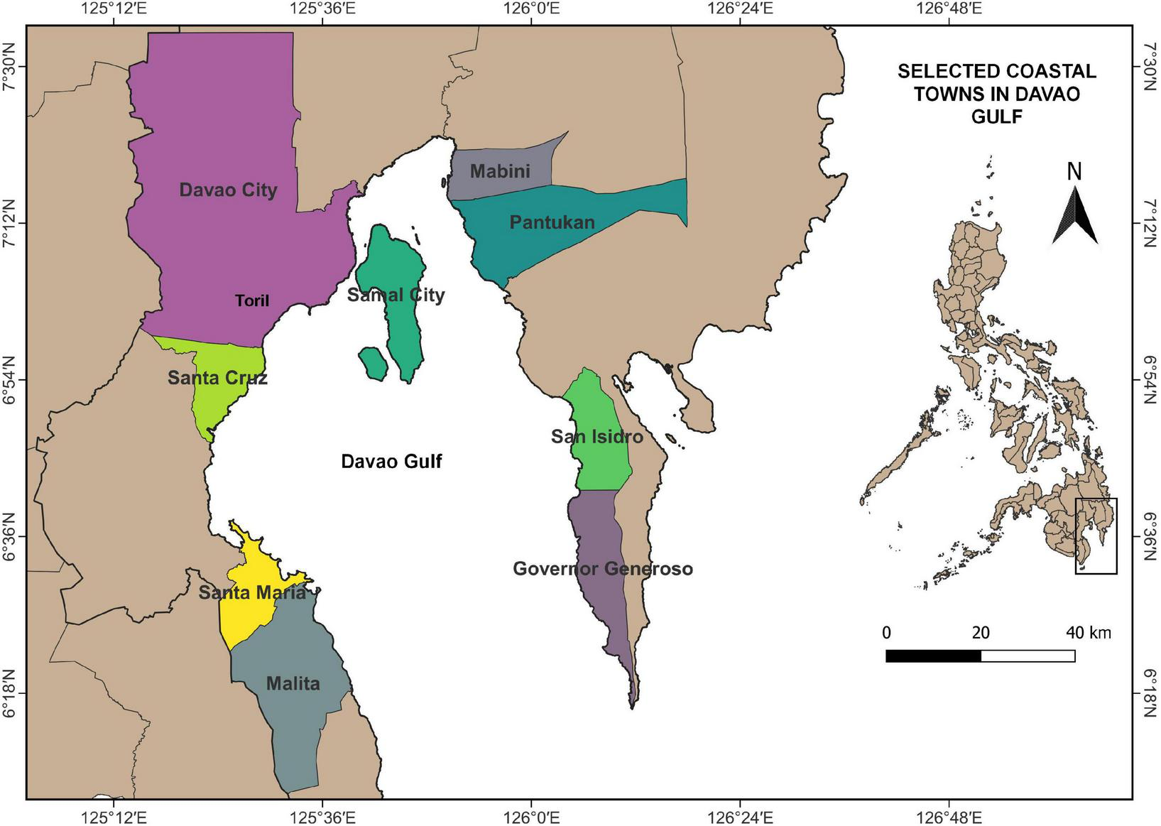 The study was conducted in Davao Gulf, located in southern Philippines on the Island of Mindanao (Figure 1). It lies approximately between 6°30′00″ North longitude and 125°58′35″ East latitude. The water surface area is about 3,087 km2 and tide in the area is predominantly semi-diurnal, with two high and two low water levels occurring in a day. Fisheries production in Davao Gulf was dominated by commercial fishing having an annual average catch percentage of 88% compared to municipal fishing (SSF) which only comprised 12% of the average catch in past years (Villanueva, 2018).