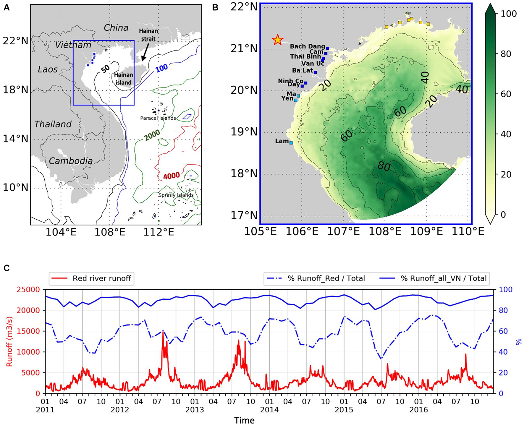 (A) Location of the Gulf of Tonkin. Blue dots show the location of the river mouths of the Red River system. Contour lines indicate the bathymetry of the area. (B) Model domain with bathymetry. The star indicates the location of Son Tay hydrological station at the apex of the delta. Blue boxes show the most upstream points where the runoffs flow to the model. Cyan and yellow boxes show the location of other river mouths in the south and north of RR, respectively. (C) Daily Red River discharge in the model configuration, from National Hydro-Meteorological Service data (red curve, left y-axis). Blue dashed line: Percentage of Red River runoff compared to total runoff (sum of runoff from Red River, other rivers in Vietnam, rivers in China). Blue line: percentage of all rivers in Vietnam (including Red and other rivers in the GOT) compared to total runoff. Blue lines are referred to the right y-axis.