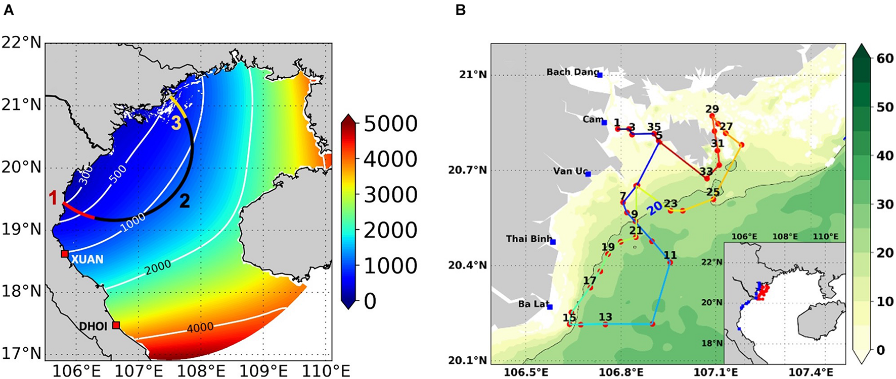 The Gulf of Tonkin (16.9°N – 21.9°N, 105.6°E – 110°E) is a small shelf sea located east of Vietnam and south of China with depth less than 100 m (Figure 1A). It is a meso-tidal region, dominated by diurnal constituents (K1, O1) as described for instance by Nguyen et al. (2014) and Piton et al. (2020). The ocean circulation of the Gulf of Tonkin (hereafter GOT) has been examined by several authors (e.g., Ding et al., 2013; Gao et al., 2014; Rogowski et al., 2019; for a recent review see Piton et al., 2021). Using model results and observational data, they all agree that the winter circulation at the gulf scale is cyclonic and driven by wind. However, in summer, the circulation is not so well explained. Wu et al. (2008) showed that the flow through Hainan Strait has an impact on the circulation in summer: if it is inflow, the circulation is mainly cyclonic and vice versa. From high-resolution model pluri-annual simulations, Piton et al. (2021) found a basin-scale anticyclonic circulation in summer. They also suggest that the surface circulation is mainly ageostrophic, as a consequence from the monsoon wind forcing, except along the Vietnamese coast where the southward coastal current has a dominant density-driven component.