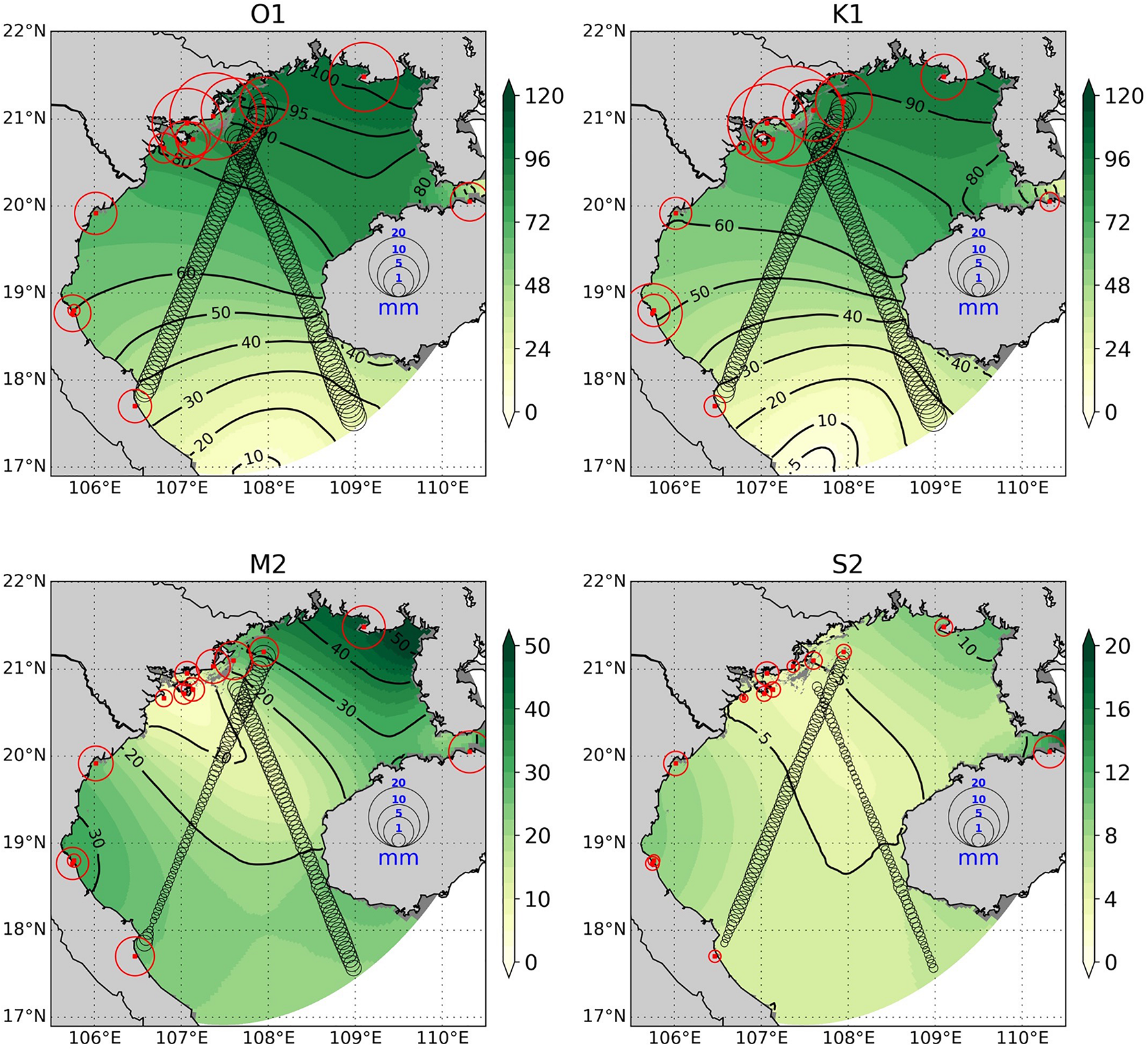 Amplitude of the tidal constituent (in colors, cm) from GOT_REF. Each figure shows the complex error (mm), calculated from the amplitude and phase, between model result and observational data for 4 main tidal constituents (O1, K1, M2, S2). Black circles show errors compared to altimetry data, while red circles indicate errors compared to the tidal gauges data.