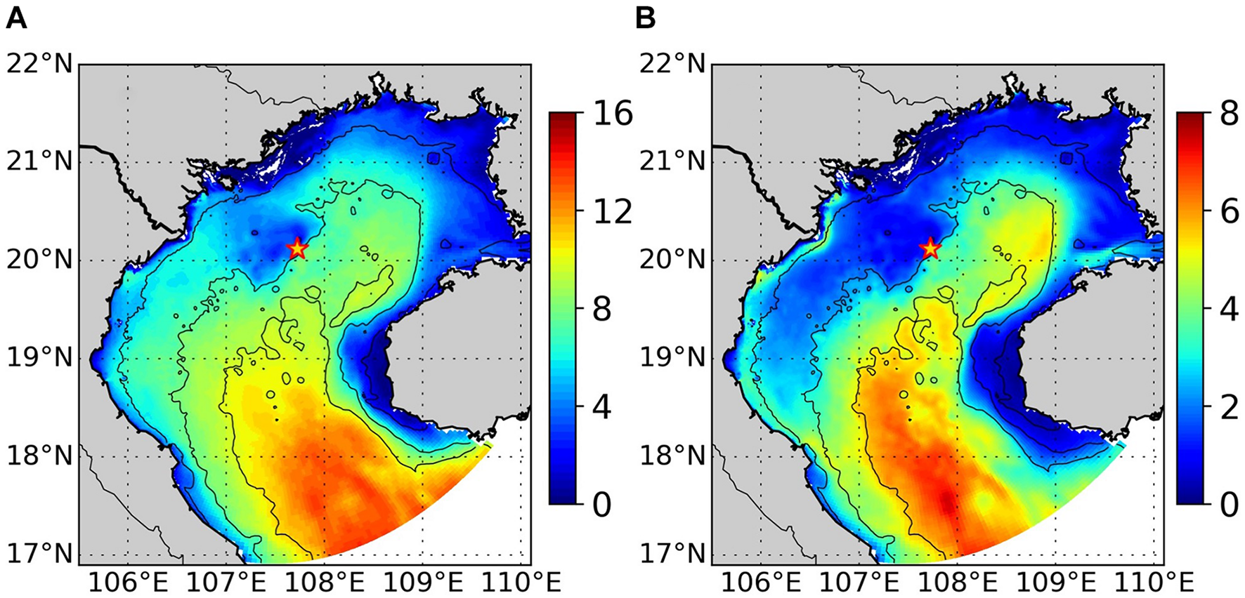 (A,B) The first baroclinic Rossby radius of deformation (km), over the period 2011 – 2016, computed from the temperature and salinity profiles averaged from April to September (A) and October to March (B). Contour lines indicate the bathymetry. Star shows the location of Bach Long Vi island. Note: Different color bar scales.