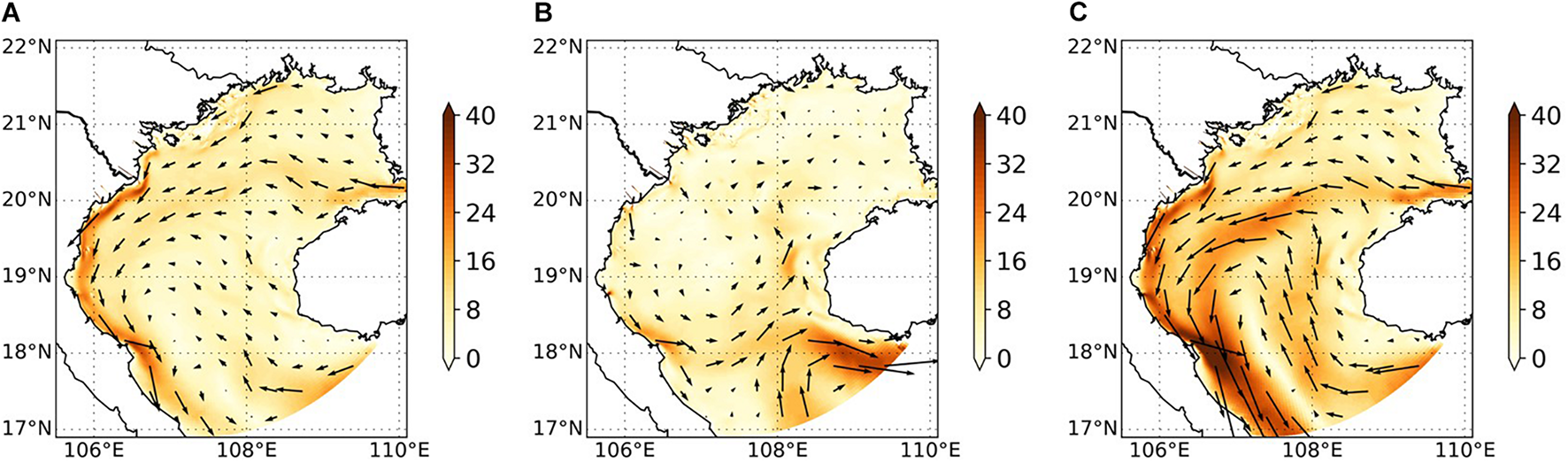 In September and October (Figure 5C), the coastal current is southward again from 21°N to the southern boundary where it exits the gulf. It reaches its maximum amplitude (∼35 cm/s) and width. Besides, the circulation is characterized by two inflows with large velocity (∼30 cm/s): one from Hainan Strait and the other from the southern boundary in the deep region.