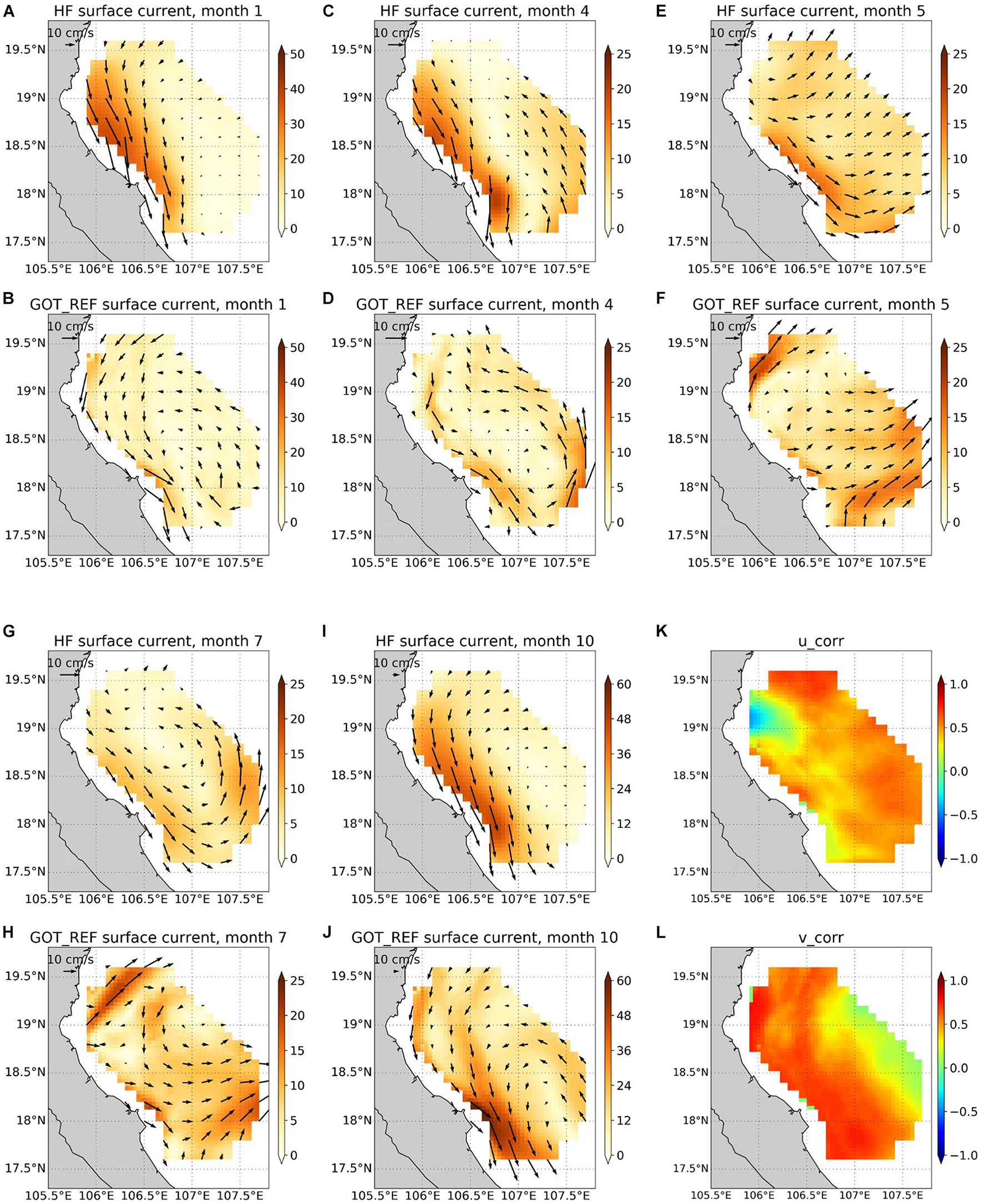 In January, the main observed coastal current is southward, with an amplitude of ∼ 30 cm/s at the coast and decreasing offshore. The model shows the same current direction, but its amplitude is underestimated by 20 cm/s (Figures 6A,B). In April, the coastal current is less intense, but the northward current at 107–107.5°E is stronger. In GOT_REF, both the southward and northward circulations are observed, with a persistent underestimation of the coastal current regarding the HFR data (Figures 6C,D). In May, the coastal current reverses north of 19°N in both the observations and simulation. At around 18°N, the simulated downcoast current is deflected eastward consistently with the HFR observations. However, both at 19°N and 18°N the simulated current is stronger than in the HFR data (Figures 6E,F). In July, HFR data show a nearly closed circulation. The coastal current flows southward at 19°N, then rotates at 18°N and flows northward and finally joins the coastal current at 19°N again. In GOT_REF, the circulation shows a more complex pattern, with a northward current (of ∼20 cm/s) at 19°N and a large temporal variability (Figures 6G,H). In October, HFR data show a similar current pattern as in January, with a strong southward coastal current (∼40 cm/s). The model shows very good consistency, with the strongest velocity near 18°N (Figures 6I,J).