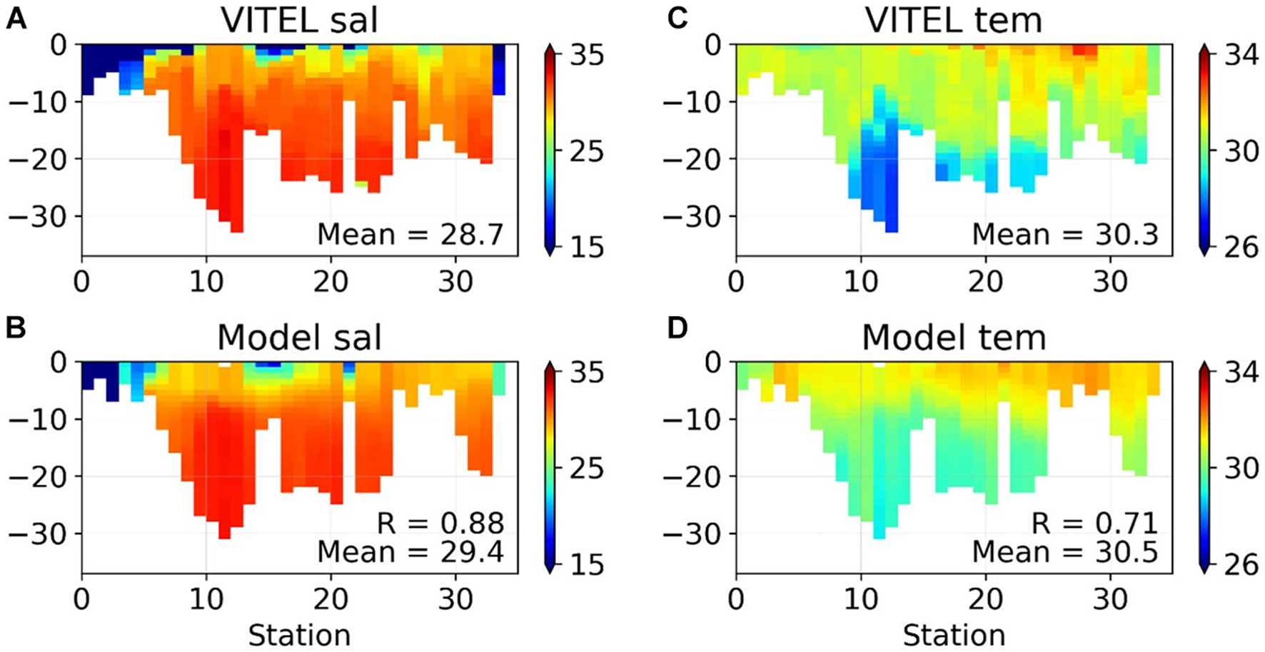 Figure 7 shows the salinity and temperature profiles from the VITEL campaign and the GOT_REF simulation. Although it is a very shallow area, the bathymetry of the model is quite accurate compared to the depth of the CTD data. The largest bathymetry misfit is reached at stations 26 to 30 where the model is too shallow by ∼10 m. Since the campaign took place in summer (July), there is a strong stratification in both salinity and temperature profiles. At the surface, the observed salinity can be as low as 15, while at the bottom it is around 34. The mean value at all points is 28.7. The model performance is good, with a correlation R = 0.88 computed from all profiles, but the mean value is overestimated by 0.7. The model overestimates the surface salinity at stations located in the shallowest area. This suggests that the river runoff is underestimated or that the simulated mixing in the estuaries is too strong, possibly due to local errors on the tidal representation.