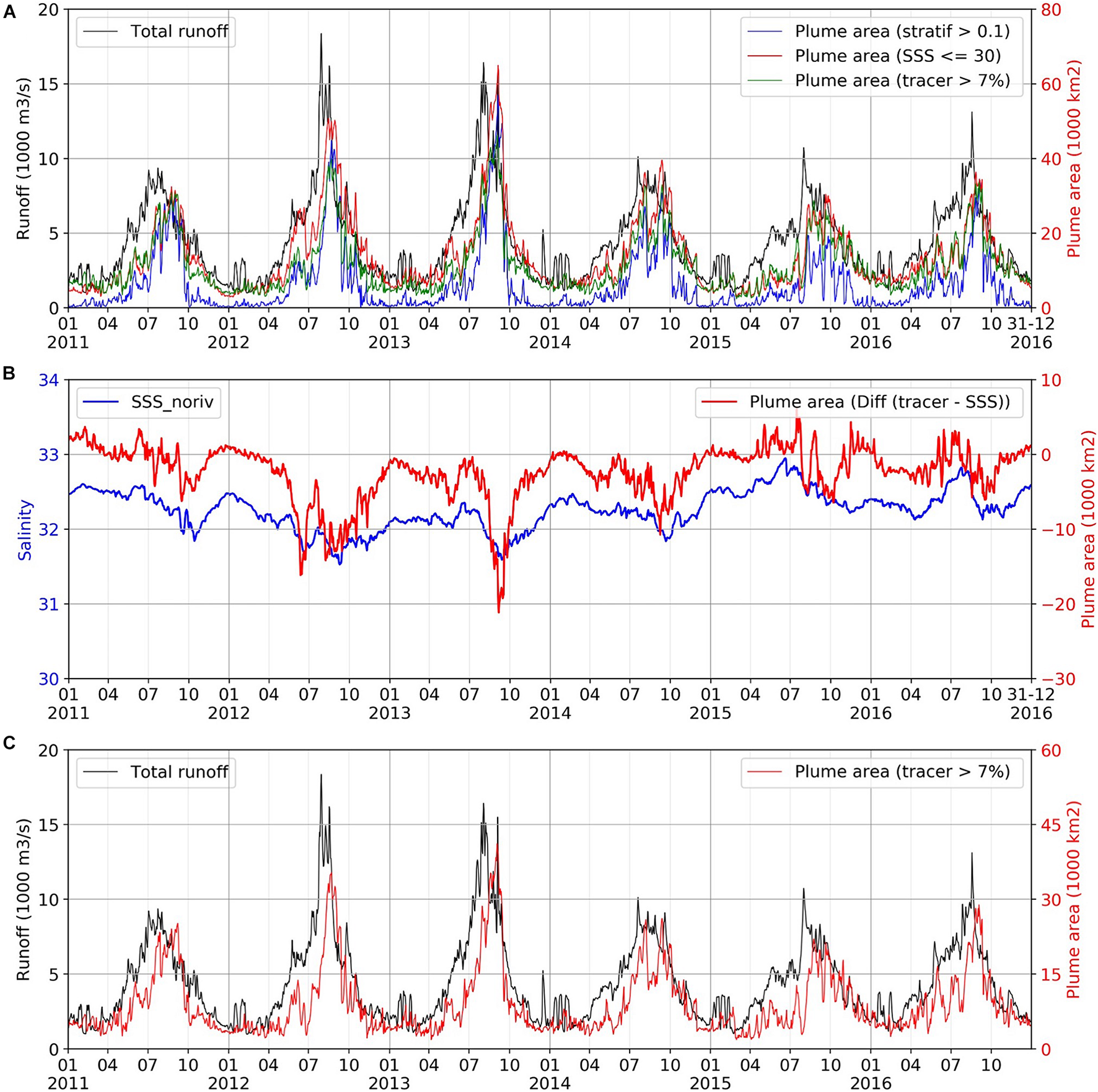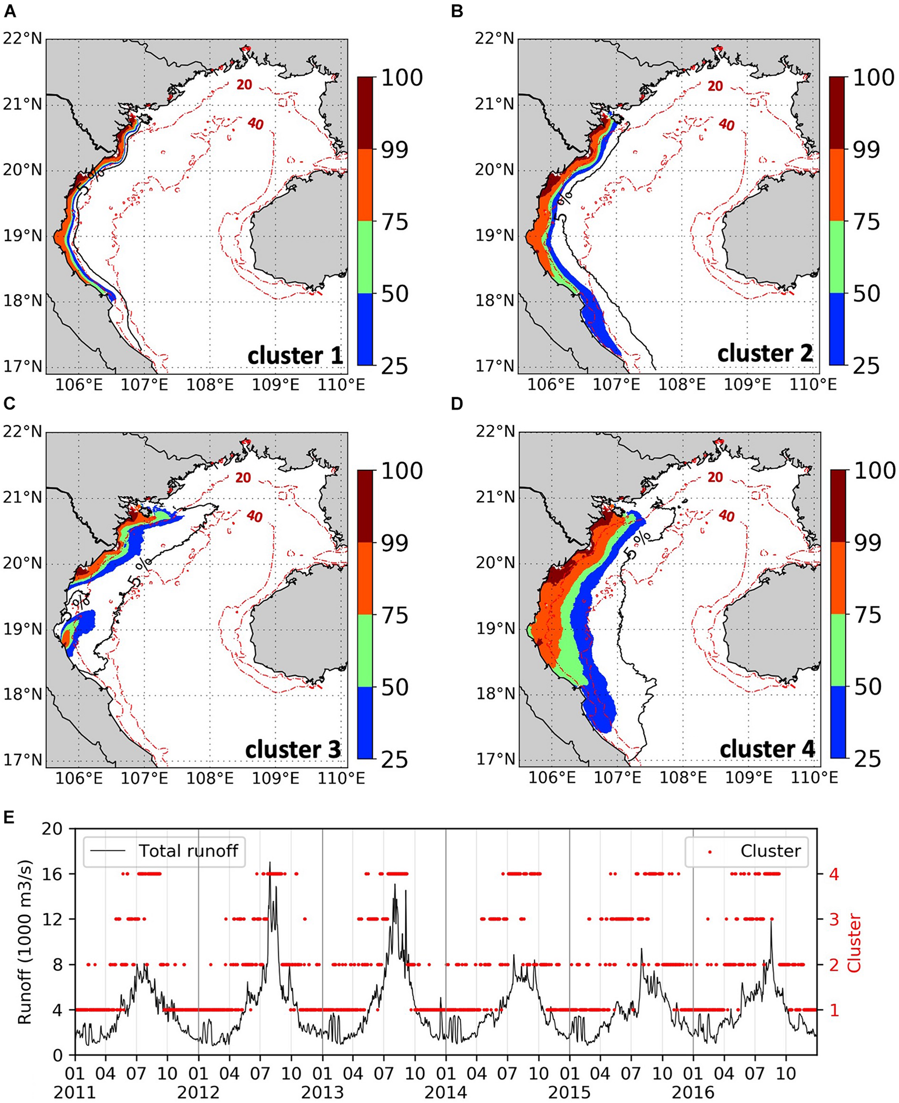 One of the expected drivers of the dynamics is the freshwater input from the continent. In the GOT, several rivers feed the gulf. The main one is the Red River (hereafter RR) system. It is formed by 3 tributaries that connect at Son Tay (Figure 1B) and then split again into several distributaries. On average, the RR’s runoff accounts for more than 60% of the total runoff in GOT (Figure 1C).
