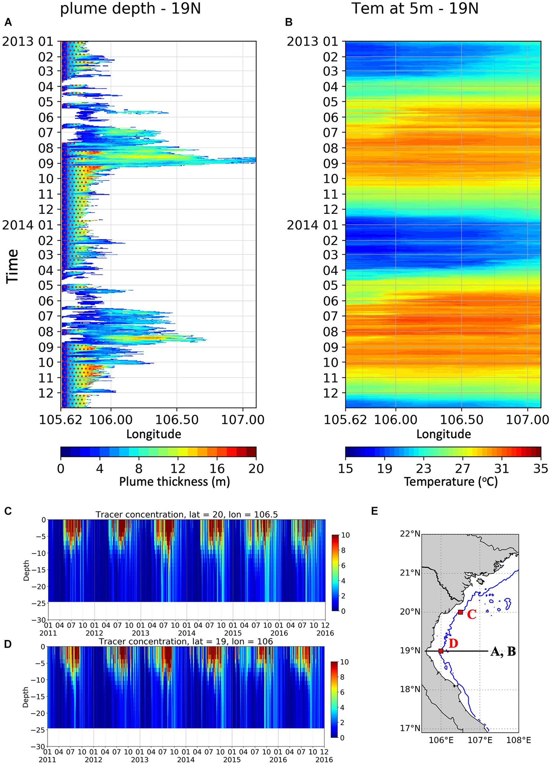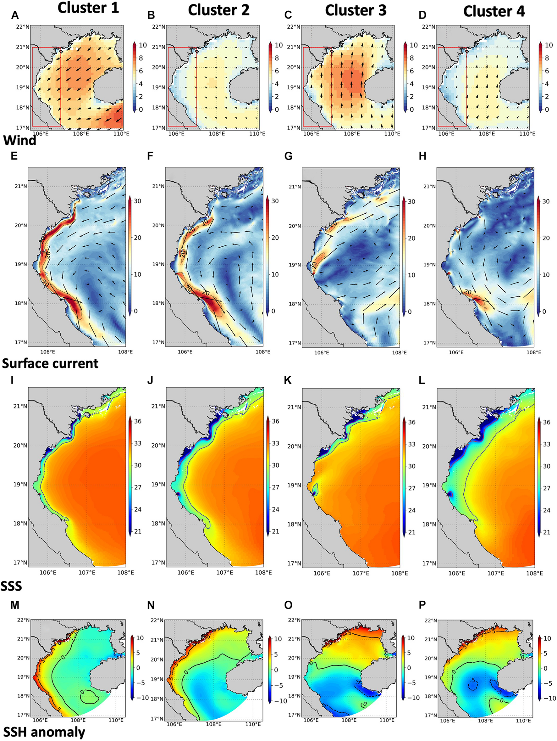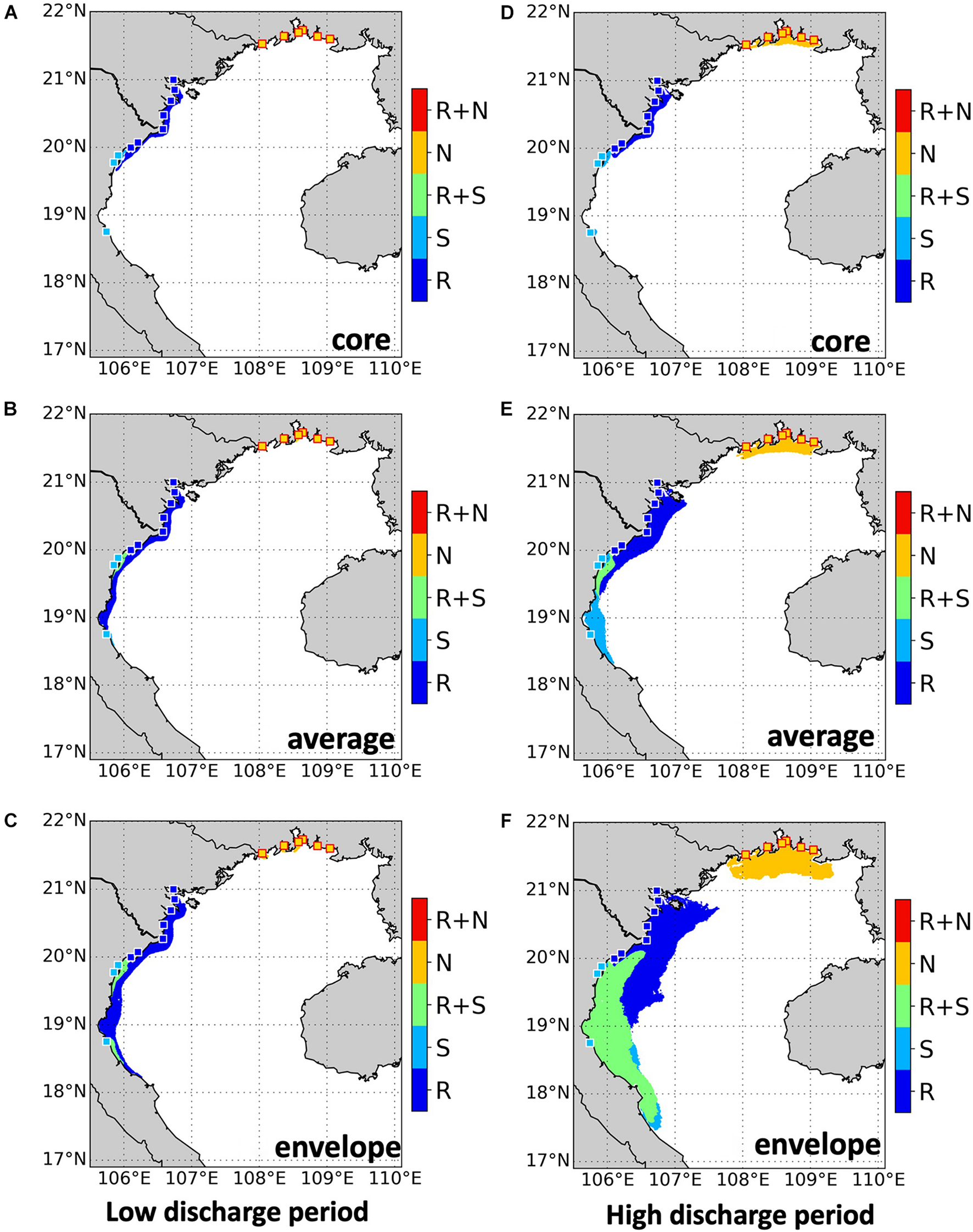In spite of its importance, to date, studies focusing on the RR plume are still scarce. Gao et al. (2013) showed that the coastal plume was found near the northern and western coasts of the gulf in winter while spreading eastward and offshore in summer. Rogowski et al. (2019) analyzed the mean seasonal circulation and suggested that the southwesterly wind direction which is prominent during the summer monsoon is the main mechanism preventing downcoast advection of the RR plume. However, that study did not attempt to explain further the temporal variations of the RR plume. In this study, we propose to take the analysis a step further and examine the plume variability in the mid-field and far-field regions (as defined by Horner-Devine et al., 2015) in more detail, using high-resolution simulations and an unsupervised learning method.