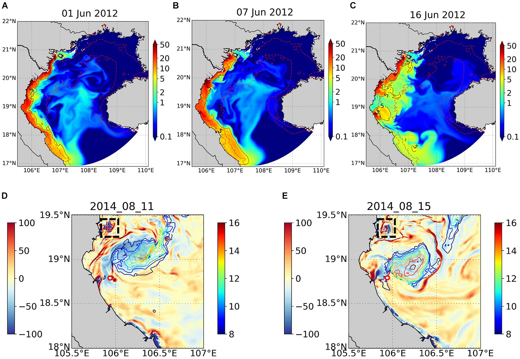 In April, the summer monsoon sets in and lasts until August. The southward coastal current weakens and becomes intermittent (Figure 5B). When present, it is deflected eastward at ∼18°N; it then splits into 2 branches. The first one forms a cyclonic circulation in the central basin. The second branch feeds an intense current south of Hainan that flows out from the gulf. This corresponds to the circulation scheme described by Gao et al. (2014) and Rogowski et al. (2019), but, in our simulation, the current variability is large at daily and interannual time scales.