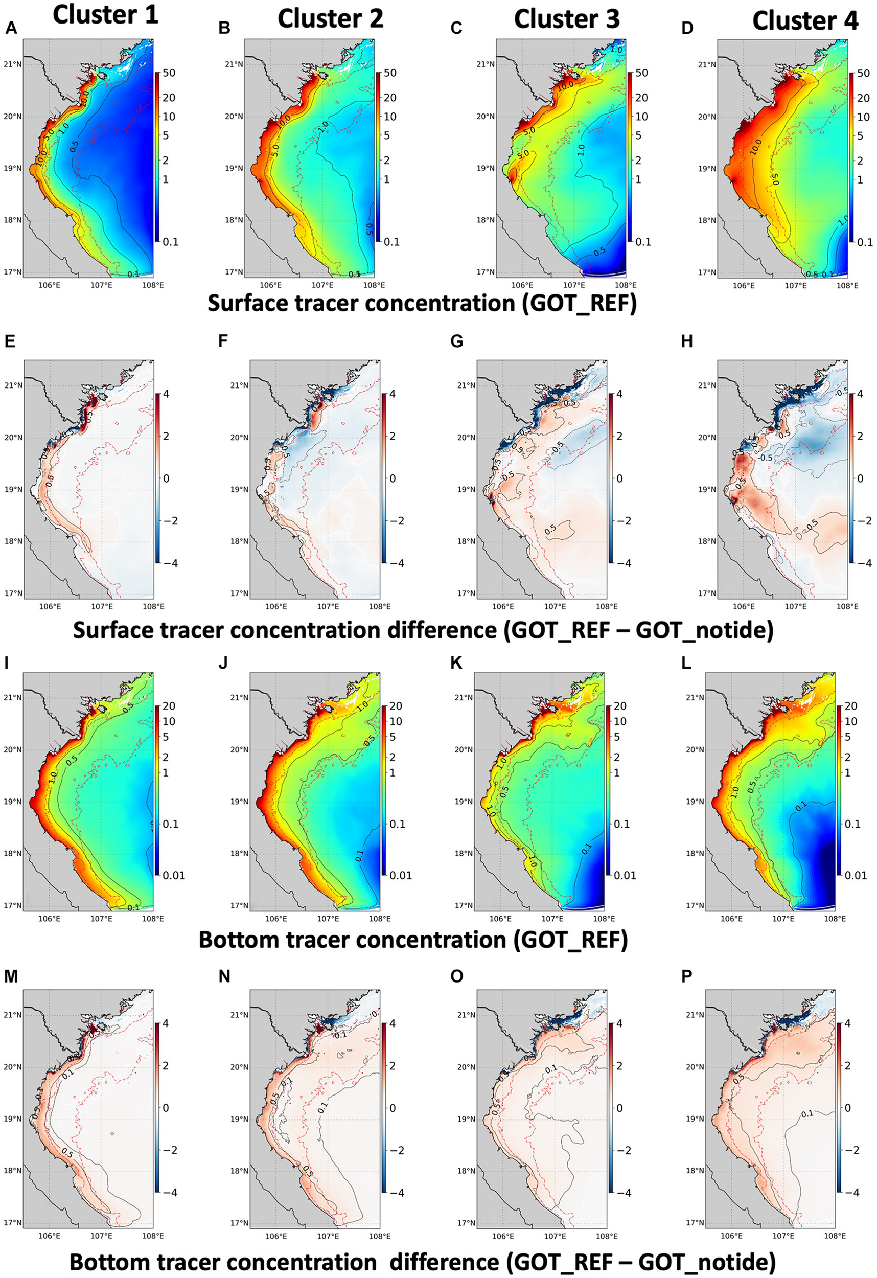 In order to simulate the pathways of the river water into the GOT, passive tracers are used. Tracers act as dyes, i.e., they do not affect the dynamics. In total, there are 3 tracers (or three colors) meant to distinguish the inputs from the different river systems. The first tracer is added to the runoff of all the Red River distributaries at constant concentration (100 arbitrary unit/m3). The second one is added at the other rivers in the south and the third one at the rivers in the north of Red River, with the same concentration (100 arbitrary unit/m3). Since tracers are injected with the runoff, they are also submitted to the 1 year of spin-up.