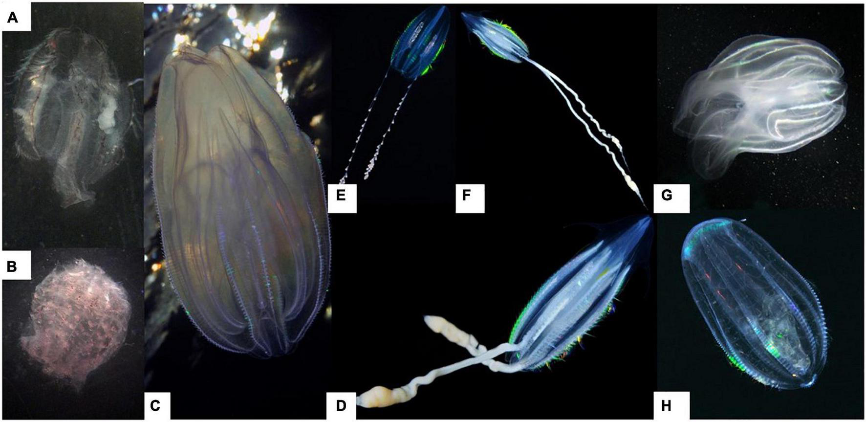 Ctenophore taxa identified along the Norwegian coast from Skagerrak to Svalbard: Typical example of net collected ctenophores (A)Mertensia ovum and (B)Beroe sp.; underwater images received from the citizen science participants (C)Bolinopsidae sp., (E)Euplokamis cf. dunlapae, (D,F) Undescribed cydippid ctenophore (same specimen), (G)Lobata spp. and (H)Beroe cucumis. Photos: (A,B) Sanna Majaneva, (C–F,H) Nils Aukan and (G) Vigdis Dahling.
