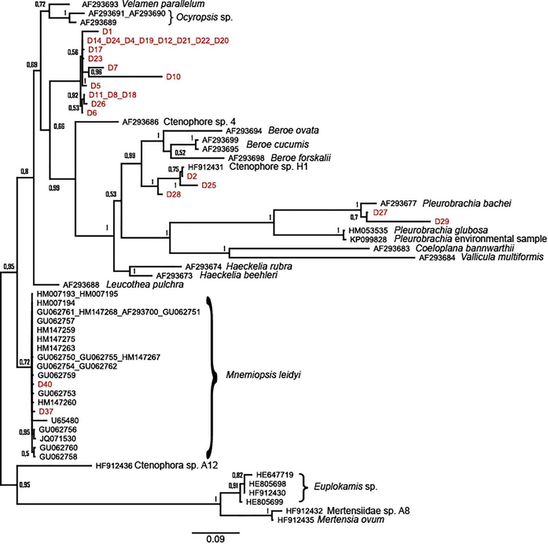 Maximum-likelihood tree for ITS1 of all ctenophore sequences in GenBank together with specimens collected in this study by the citizen science approach (marked red, D1-D40, see Table 1 for more information).