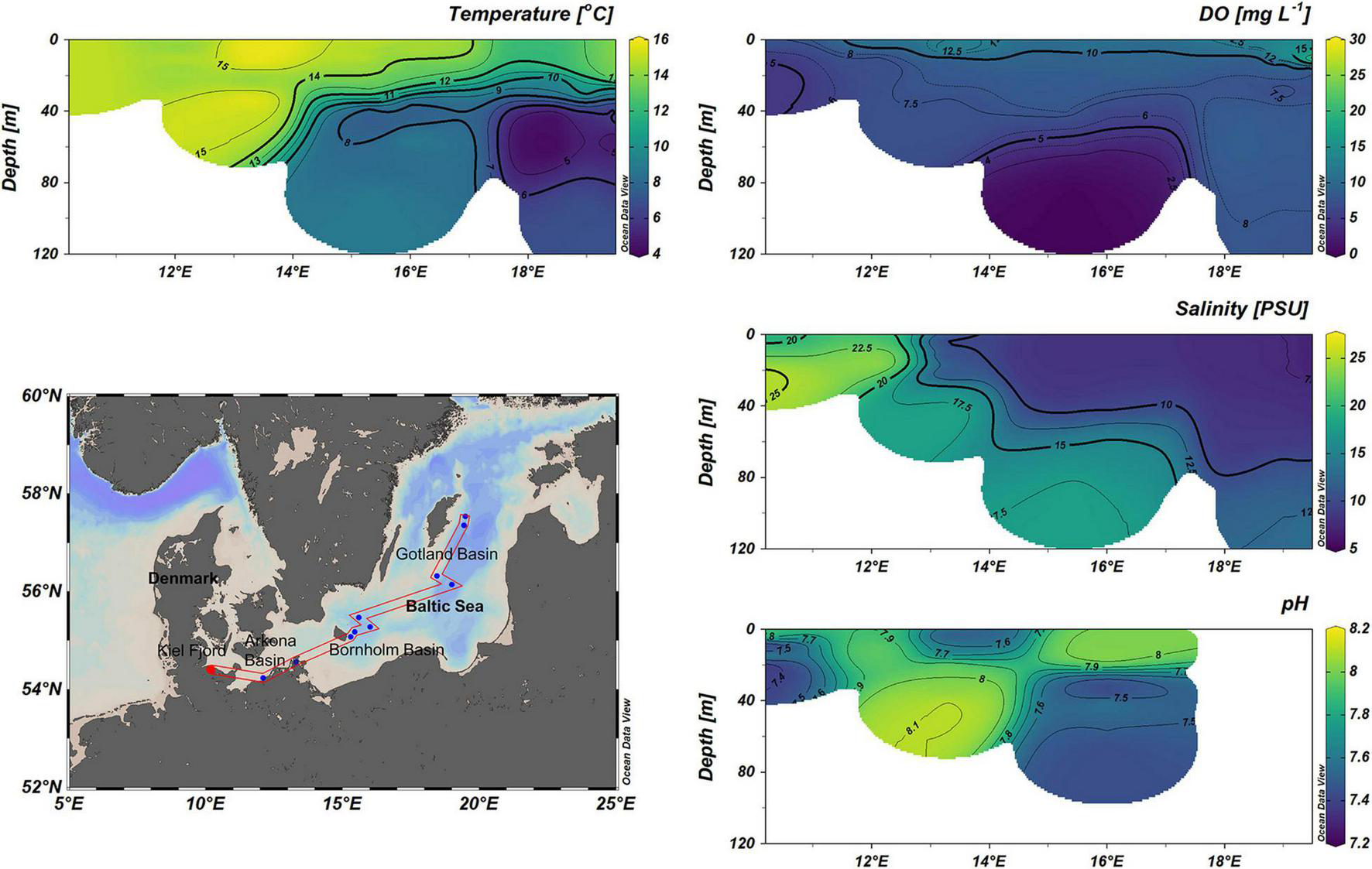 Sampling distributions and vertical profiles of temperature, salinity, pH, and concentrations of dissolved oxygen in the Baltic Sea.