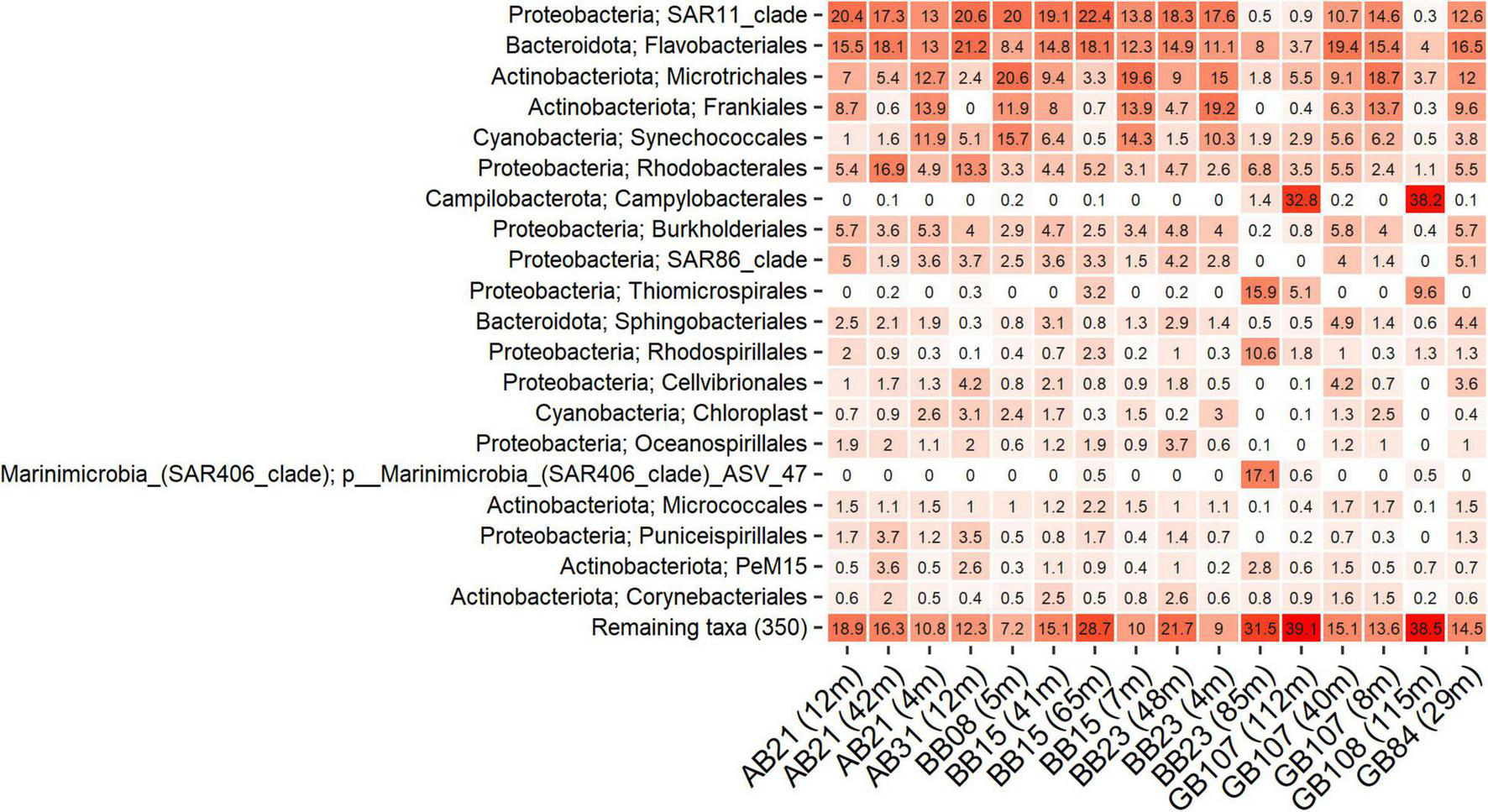 A total of 89 bacterial phyla were identified from all our 16 samples, involving 8 stations of three basins and 1–3 depths in each station (Supplementary Figure 1). Proteobacteria, Actinobacteriota and Bacteroidota dominated the bacterial community in all samples, accounting for 15.9–55.8%, 5.4–36.6%, and 9.9–27%, respectively. Campilobacterota or Desulfobacterota were prominent phyla only in deep waters of GB (32.8–38.2% and 9.5–14.4%, respectively). In contrast, Cyanobacteria were dominant in surface waters (< 8 m) and decreased dramatically to 0.5% in deep waters. In the level of order, except for deep samples from below 85 m, the SAR11 clade belonging to Proteobacteria was the top order in most samples (Figure 2). Flavobacteriales and Microtrichales belonging to Bacteroidota and Actinobacteriota, respectively, were also top orders in many samples (Figure 2). In oxygen depleted waters, especially at station BB23 at 85 m water depth, the dominant orders were substantially different compared to other samples, with Thiomicrospirales representing 15.9%, Rhodospirillales representing 10.6% and the SAR406 clade representing 17.1% (Figure 2).
