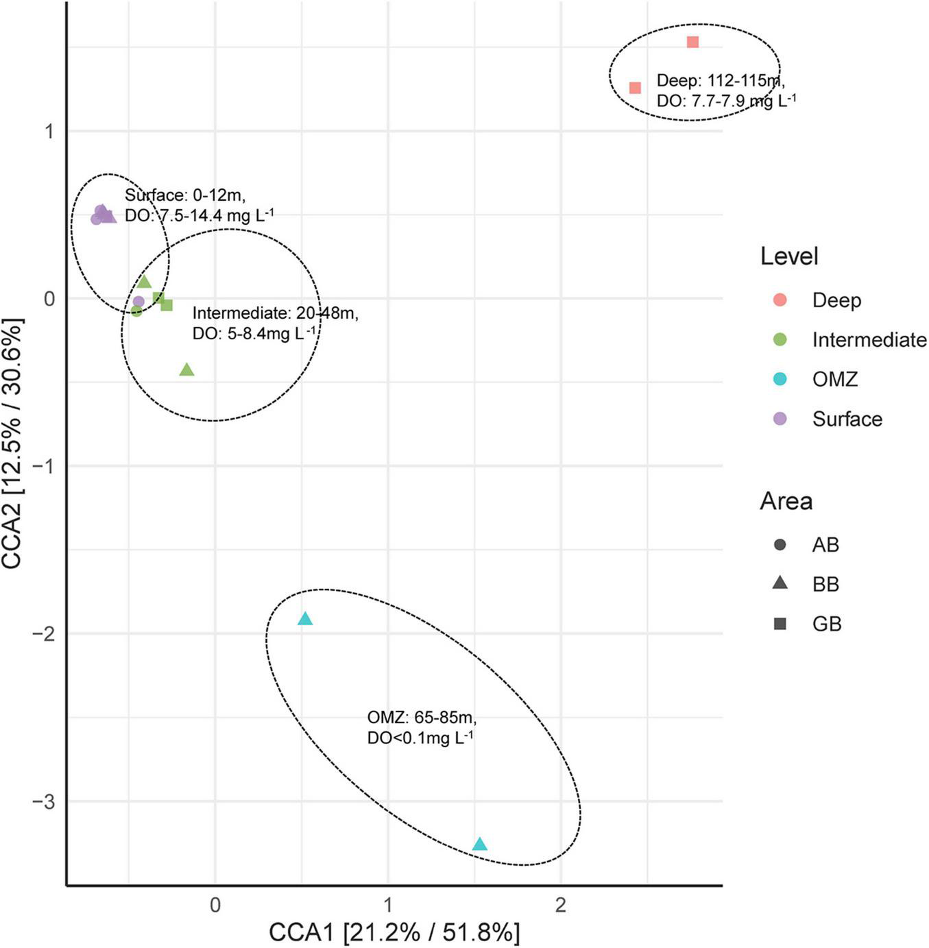 Canonical correspondence analysis (CCA) plot depicting microbial composition from four groups of water areas (surface; intermediate; OMZ; deep) across three basins (AB, BB, and GB) in the Baltic Sea.