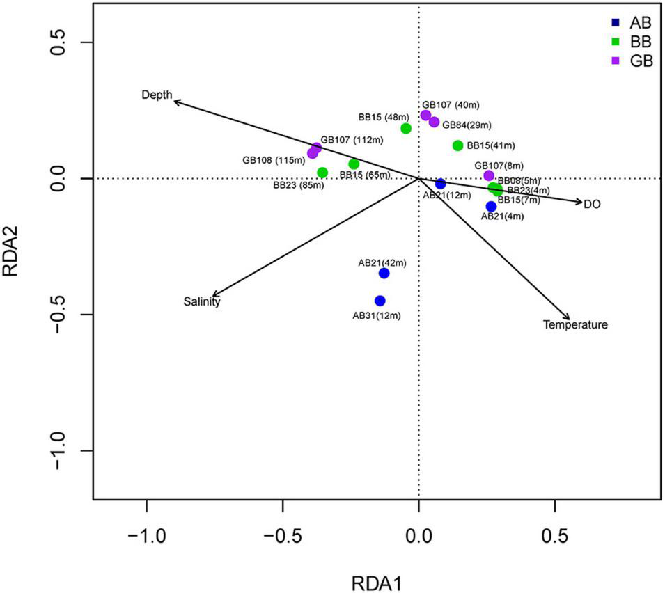 In terms of the alpha diversity of bacterial communities present in the different samples, there were 167–406 ASVs identified across the three basins (AB, BB, and GB), and the Shannon indices ranged from 3.65 to 4.93 (Table 2). Moreover, the Shannon diversity of samples was low (< 4) in samples from deeper waters (BB23_85 m, GB107_112 m, GB108_115 m). Notably, the highest number of ASVs was observed in oxygen depleted waters (O2 = 0.08 mg L–1, BB15_65 m).