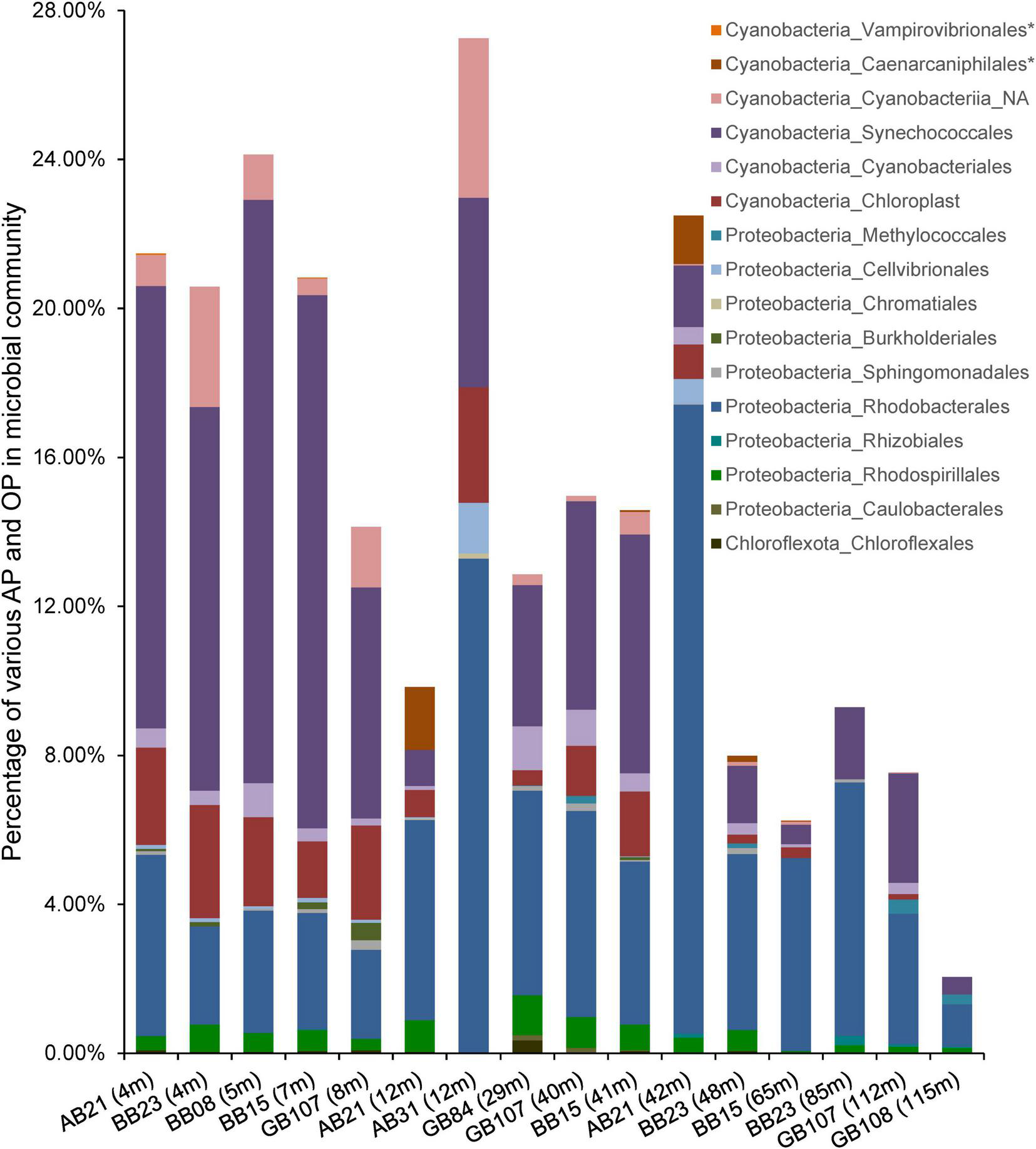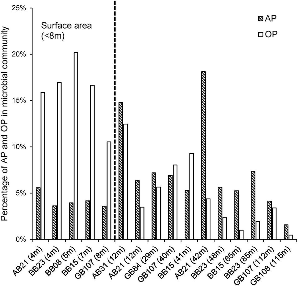 We found similar relative abundances of AP and OP (Cyanobacteria) in all 16 amplicon datasets, with AP representing 1.58–18.11% (6.47% on average) and OP representing 0.47–20.18% (8.29% on average, Figure 5). OP outnumbered AP in surface waters shallower than 8 m, while AP were more abundant in waters below 8 m. Relative abundances of OP decreased from 16.04% ± 3.48% in surface waters to 4.77% ± 3.76% in waters below (< 8 m). Relative AP abundances did not vary only with depth but also along the cruise track with higher abundances in the Arkona Basin (11.21% ± 6.2%), followed by the Bornholm Basin (5.04% ± 1.3%), and the Gotland Basin (4.68% ± 2.37%). These different distributions may be due to their different adaptation to their environmental surroundings. OP abundances were negatively correlated with depth and positively correlated oxygen, and temperature, while AP abundances were positively correlated with salinity (Table 3).